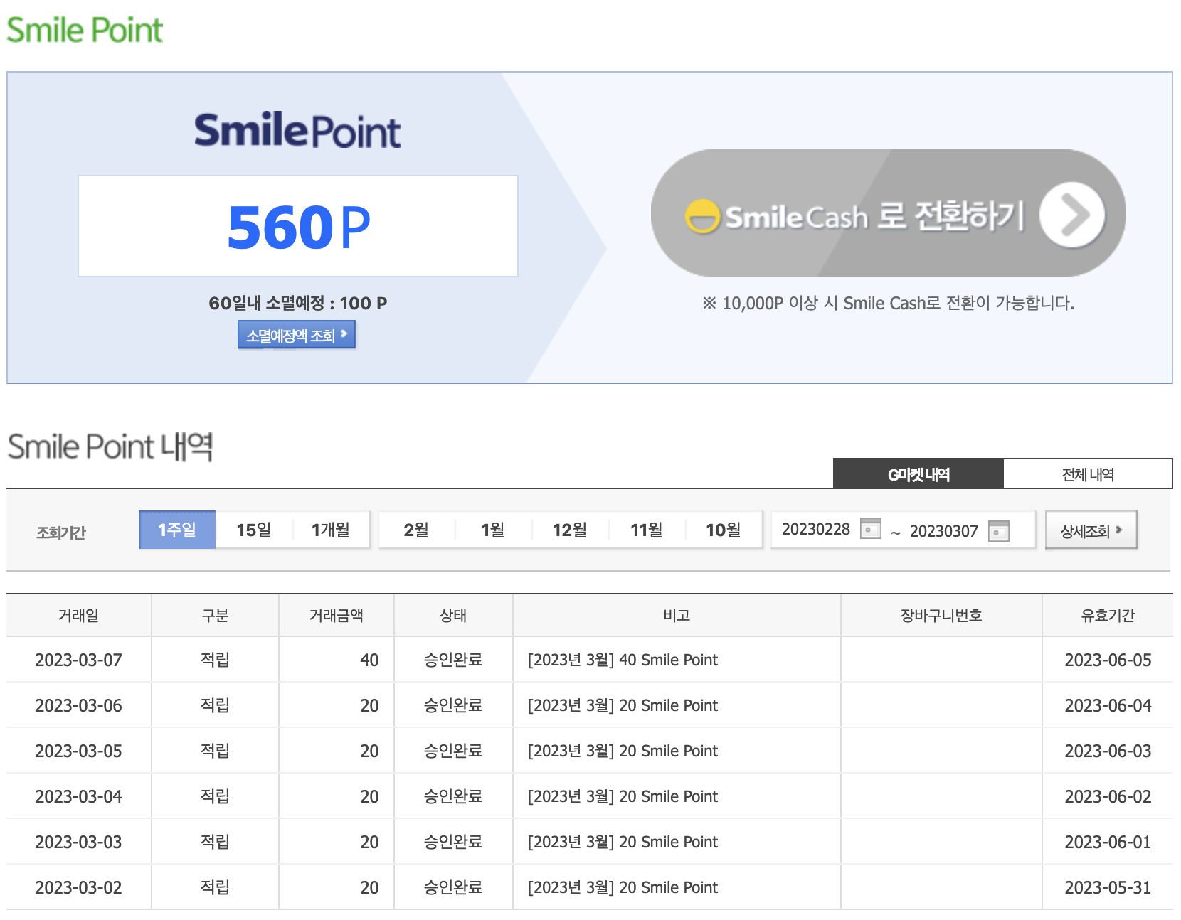 G마켓 지마켓, 옥션 스마일포인트 사용처는 가장 기본적으로 스마일캐시로 전환해서 사용이 가능합니다. 문제는 스마일포인트 10,000포인트를 모았을때 스마일캐시 전환이 가능합니다. 그럼 오래 오래 쌓아서 변경하면 되지 생각이 드시죠? 하지만 이게 쉬운 일은 아닙니다. 받는 포인트도 적을 뿐더러 유효기간도 있기 때문에 10,000포인트 이전에 소멸되는 포인트가 생깁니다.