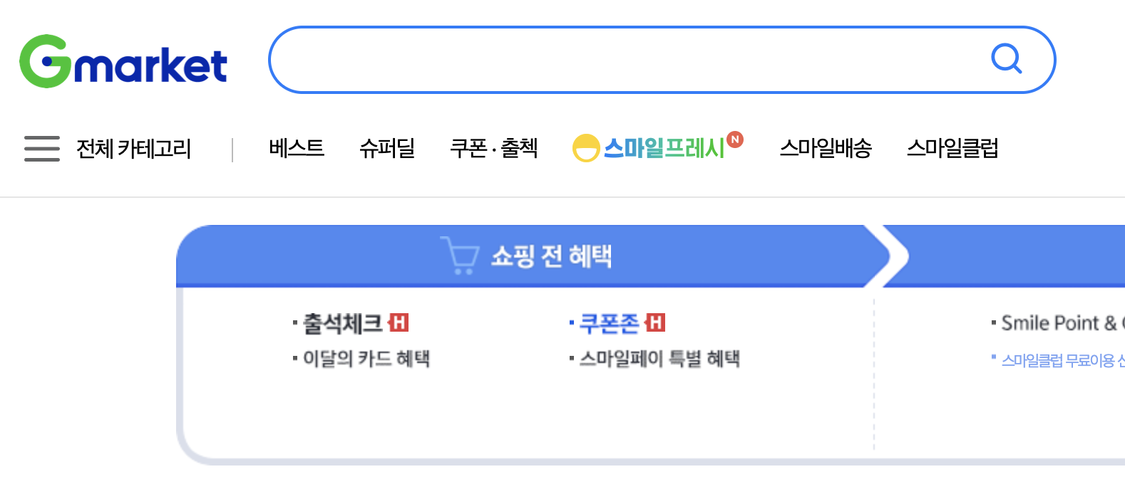 예를 들어 G마켓 지마켓 상단 메뉴에 보면 쿠폰, 출첵 메뉴가 있죠. 여기를 선택해 들어가서 아래로 쭉 내려 봅니다.