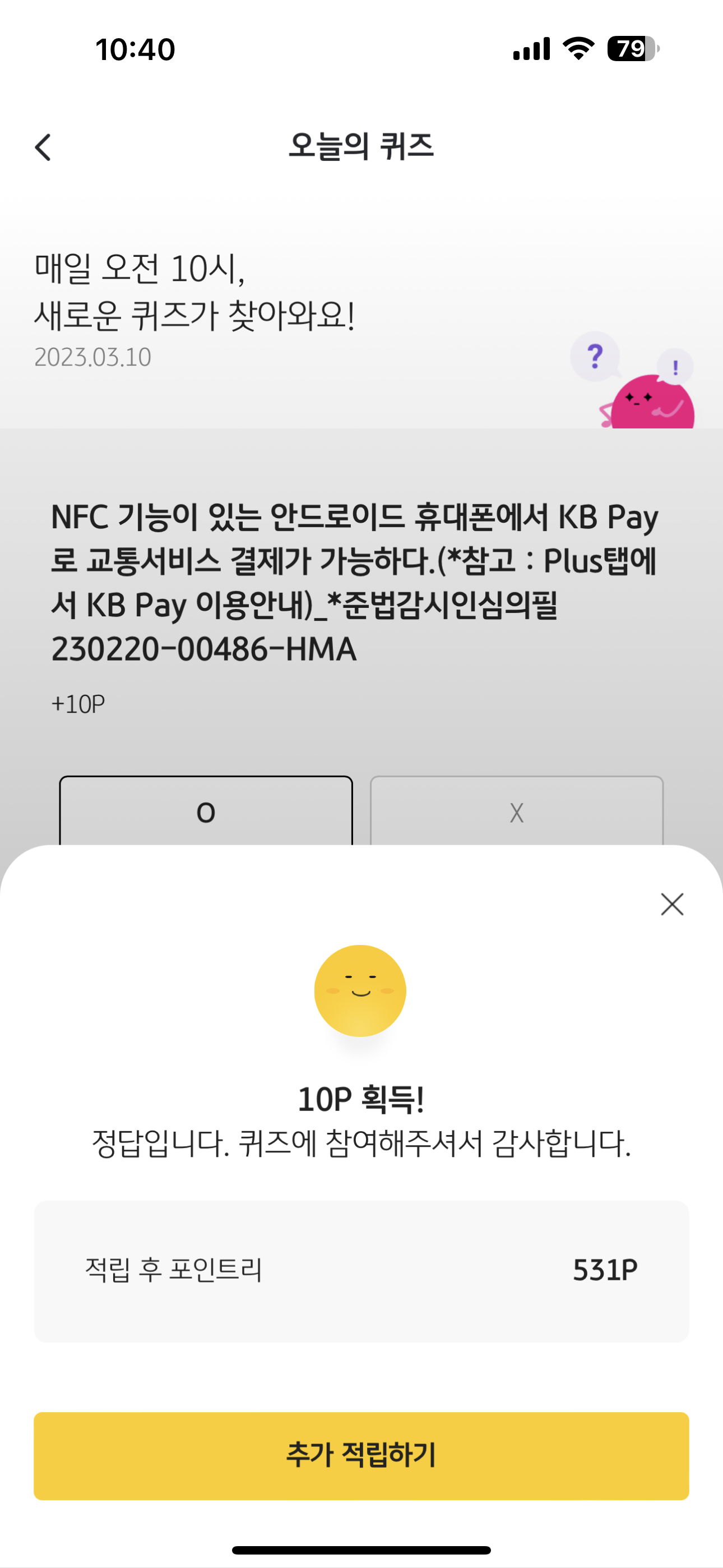 리브메이트 KB PAY 오늘의 퀴즈 3월 10일 정답은 O 입니다