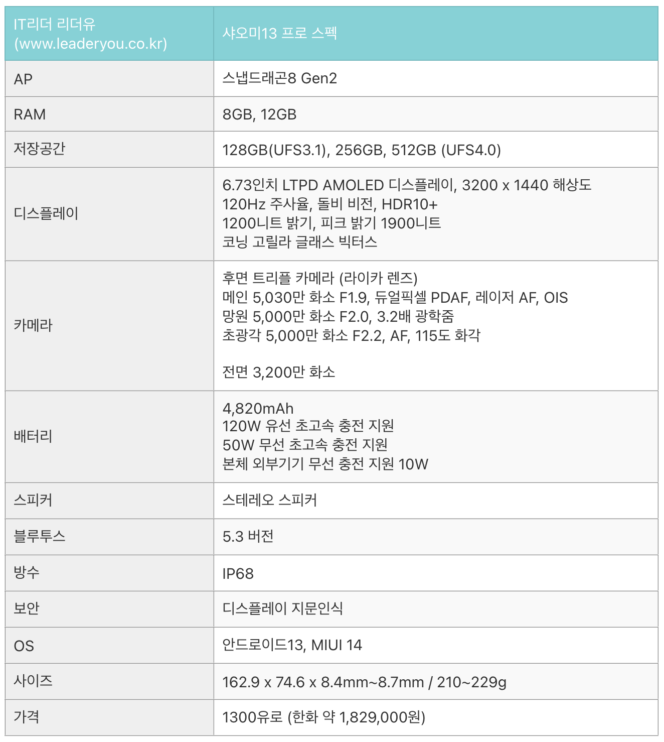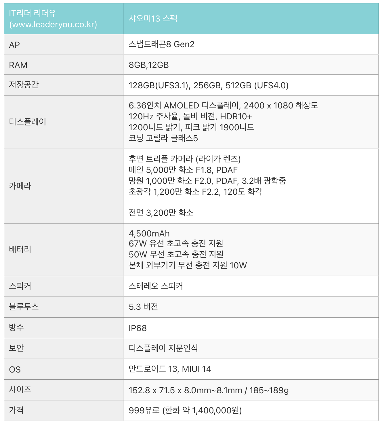 샤오미 13 스펙도 전체적으로 갤럭시S23 시리즈와 비슷한 성능을 가지고 있습니다.