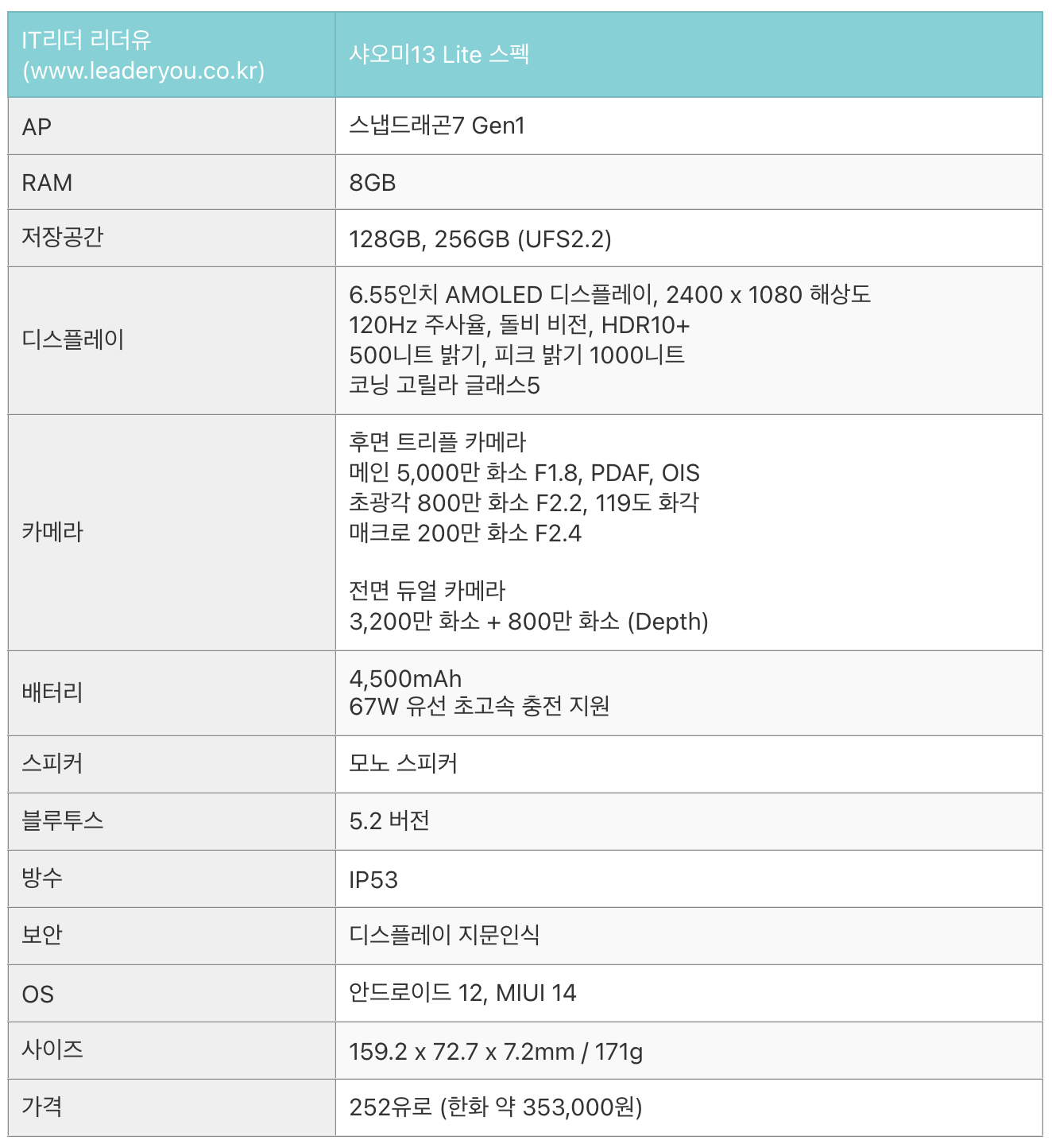 다음은 샤오미 13 라이트 스펙입니다.