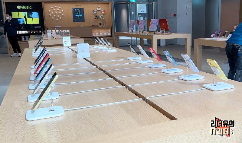 애플스토어 명동 (애플 명동) 안쪽 전시 공간을 보면 아이폰14 색상을 보기 좋게 전시해 두었습니다. 새로운 색상인 아이폰14 옐로 까지 전시가 되어 있으니 비교하면서 색상 고민의 답을 찾아볼 수 있습니다.