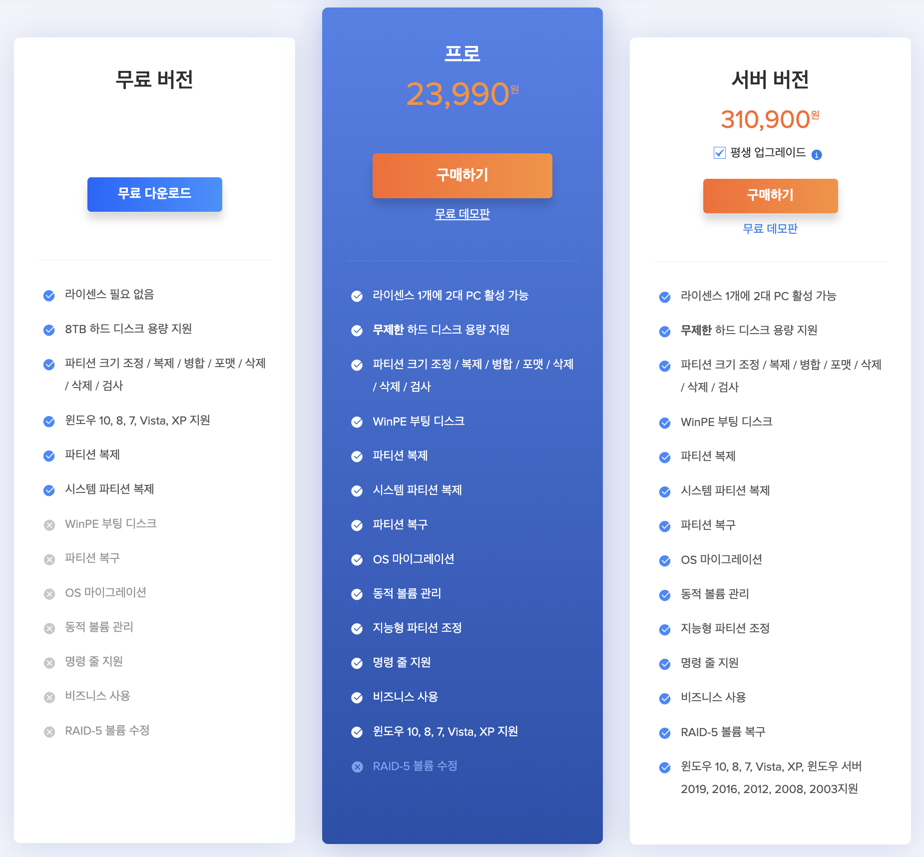 이지어스 파티션 관리 프로그램 무료와 유료의 차입니다. 기본적으로 파티션 크기 조정/ 복제/병합/포맷/삭제/검사를 지원하고 파티션 복제, 시스템 파티션 복제 기능은 다 가능합니다. 하지만 WinPE 부팅 디스크, 파티션 복구, OS 마이그레이션, 동적 볼륨 관리 등은 이지어스 파티션 관리 프로그램 프로 버전으로 가야 사용이 가능합니다.