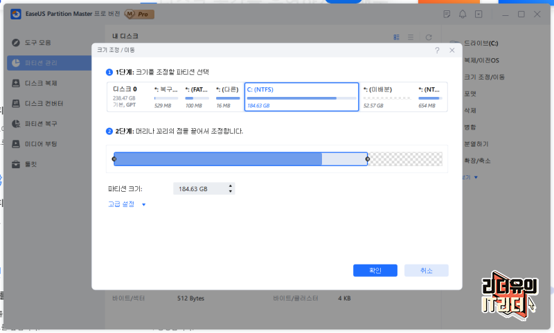 컴퓨터 파티션 분할을 하려고 한다면 저장 공간을 선택하면 아래 세부적인 저장공간이 나오고 끌어서 조정을 할 수 있습니다. 파란색으로 표시된 영역이 현재 저장공간을 차지하고 있는 파일 용량입니다. 만약 여유공간이 나오지 않게 파티션을 구분하려고 하면 빨간색으로 표시해 주의를 주고 있습니다. 안정된 파티션 분할을 할 수 있게 스마트한 파티션 관리를 지원합니다.