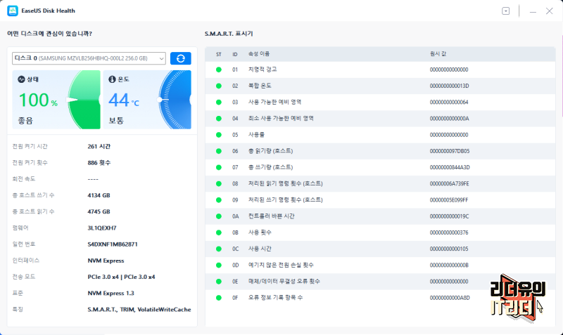 디스크 상태를 확인해 본 결과 입니다. 온도까지 측정해 주고 어떤 상태에서 상세하게 볼 수 있어 좋습니다.