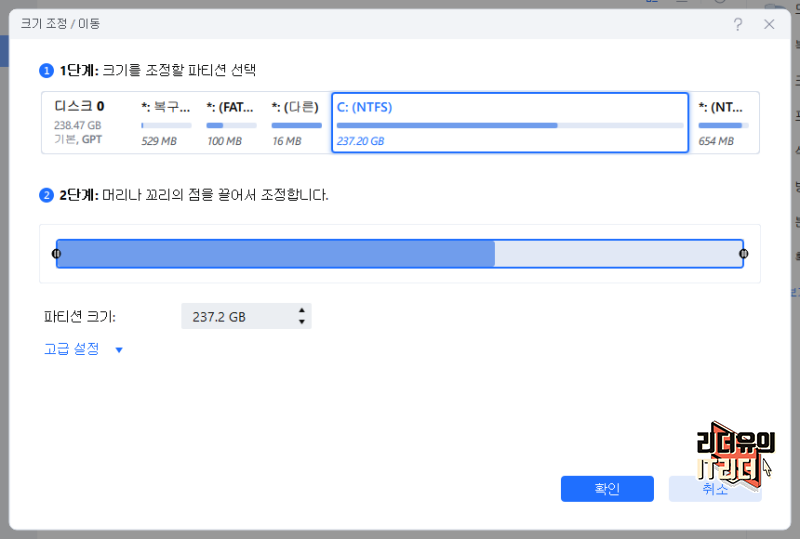 컴퓨터 파티션 분할을 하려고 한다면 저장 공간을 선택하면 아래 세부적인 저장공간이 나오고 끌어서 조정을 할 수 있습니다. 파란색으로 표시된 영역이 현재 저장공간을 차지하고 있는 파일 용량입니다. 만약 여유공간이 나오지 않게 파티션을 구분하려고 하면 빨간색으로 표시해 주의를 주고 있습니다. 안정된 파티션 분할을 할 수 있게 스마트한 파티션 관리를 지원합니다.