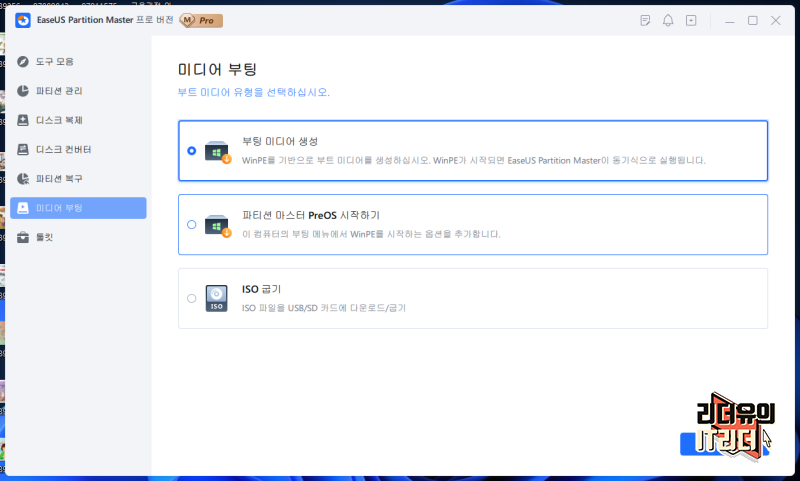 미디어 부팅 기능으로 부팅되지 않는 윈도우를 임시로 부팅하게 해주는 WinPE 기반으로 부팅 미디어를 만들 수 있습니다.