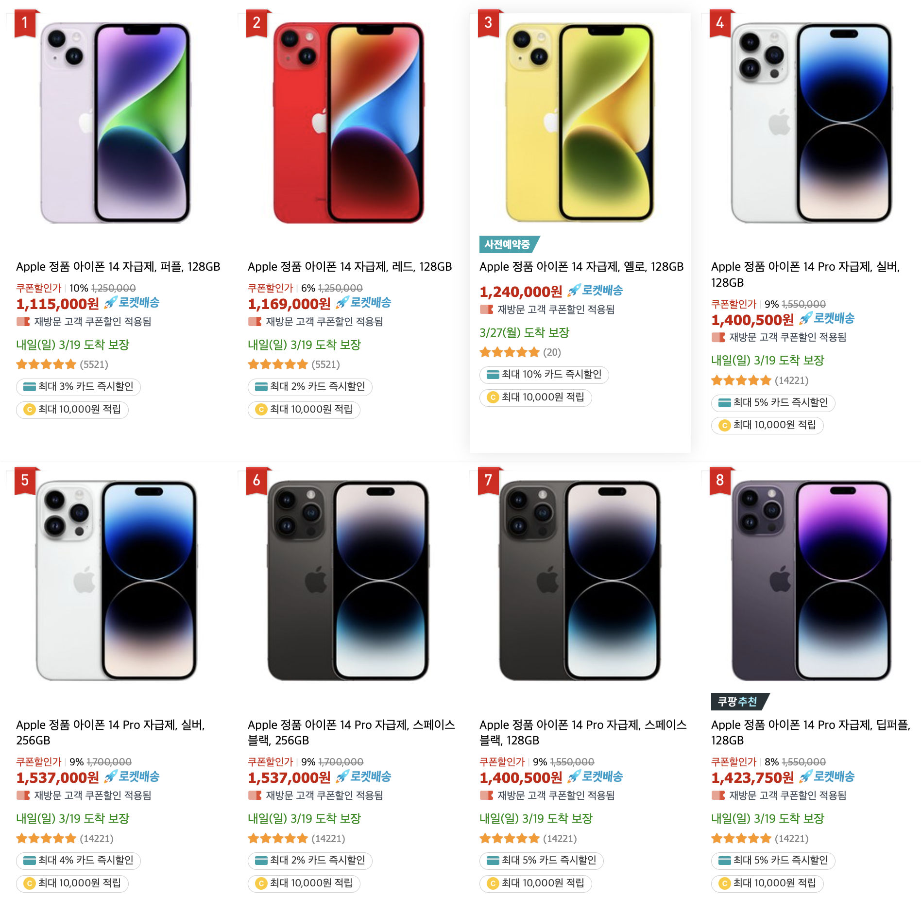 가장 저렴하게 판매되는 채널은 쿠팡 입니다. 쿠팡 같은 경우는 국내에서 가장 큰 유통망을 가지고 있고 무엇보다 오프라인 매장을 따로 운영하지 않기 때문에 여러 할인 혜택이 더해집니다. 그래서 쿠팡 같은 경우는 사전예약이 시작되면 가장 먼저 품절이 되는 판매 채널입니다. 그리고 아이폰14 할인을 기본적으로 해서 판매를 하고 있습니다.