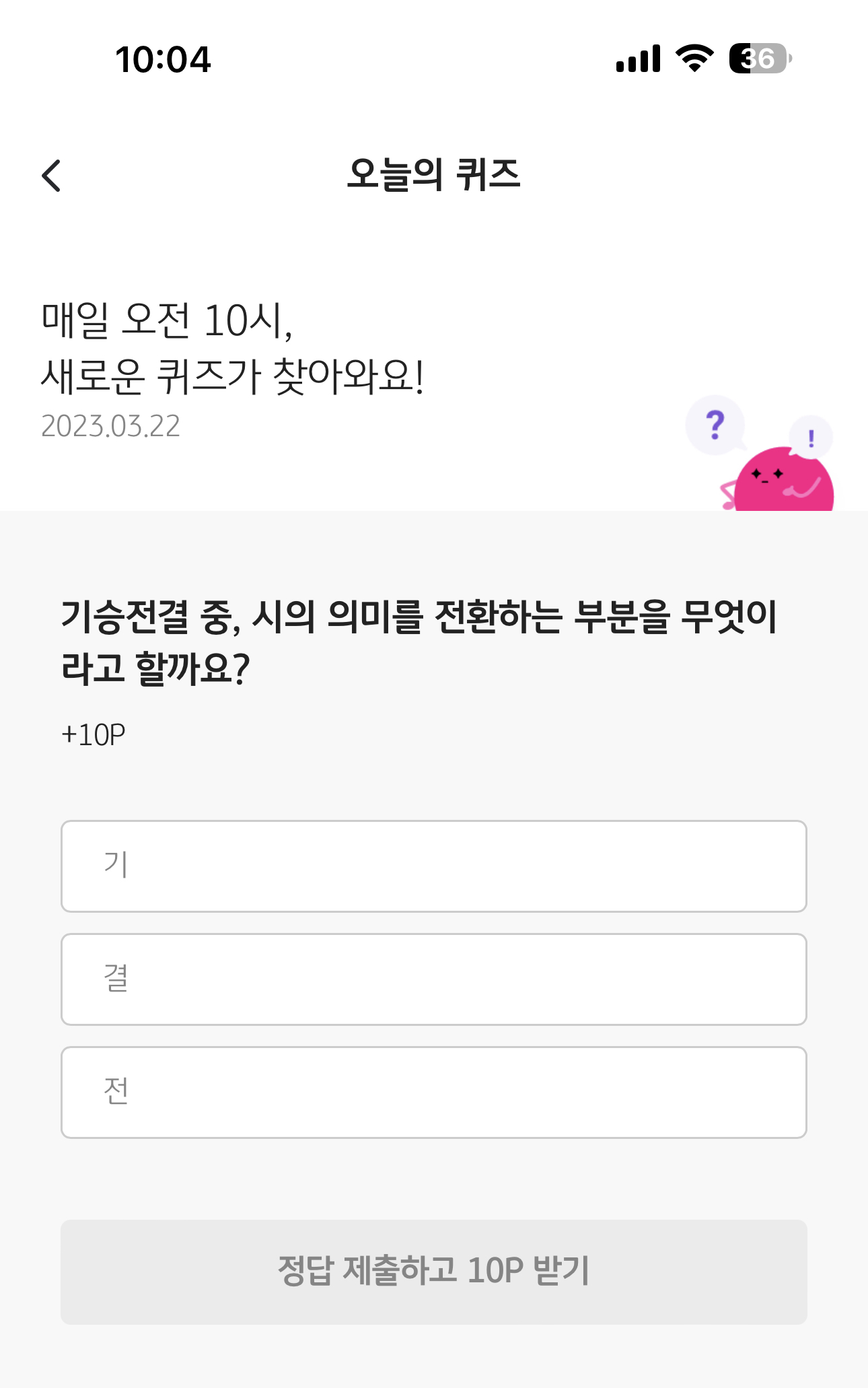 기승전결 중, 시의 의미를 전환하는 부분을 무엇이라고 할까요? 보기는 1. 기 2. 결 3. 전 입니다. 기승전결은 많이 쓰는 단어이지만 은근 잘 모르는 내용이죠. 동양의 전통적인 시작법의 한 종류로 한시의 시작에서 절구체의 전형적인 구성품을 지칭하는 용어이기도 합니다. 기구에서 시상을 일으키고 승구에서 그것을 이어받아 발전시키며 전구에서 장면과 시상을 새롭게 전환시키고 결구는 전체를 묶어서 여운고 여정이 깃들도록 끝맺는 것입니다.