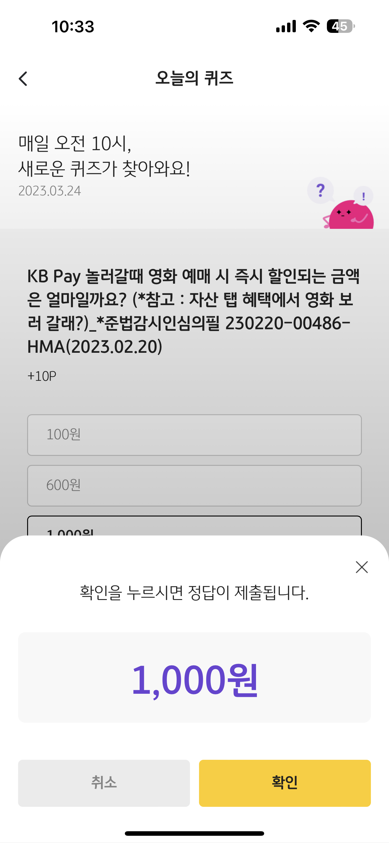 KB Pay 오늘의 퀴즈 3월 24일 정답은 1,000원 입니다