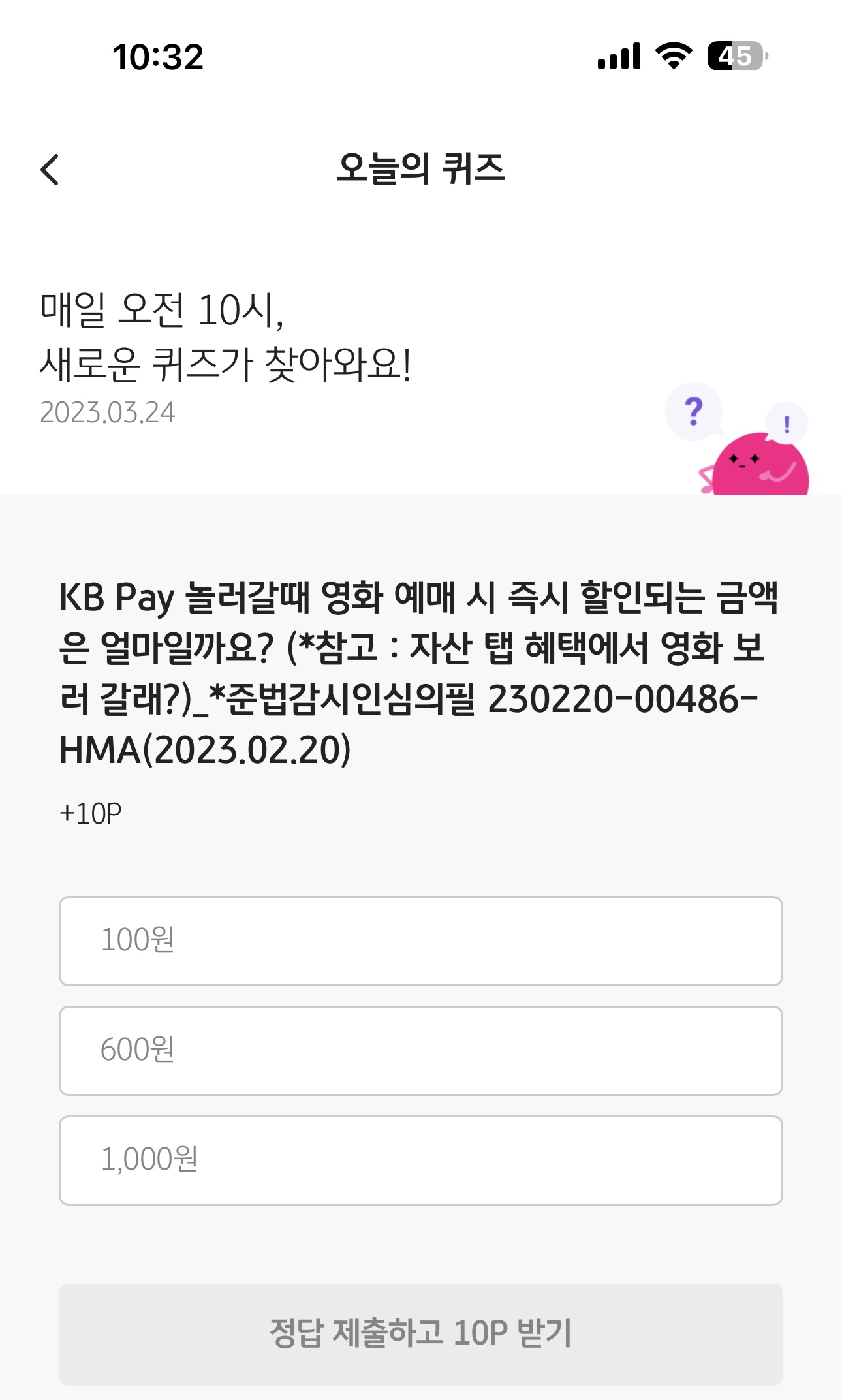 KB PAY 오늘의 퀴즈 3월 24일 정답 ( KB Pay 놀러갈때 영화 예매 시 즉시 할인되는 금액은 얼마일까요? )