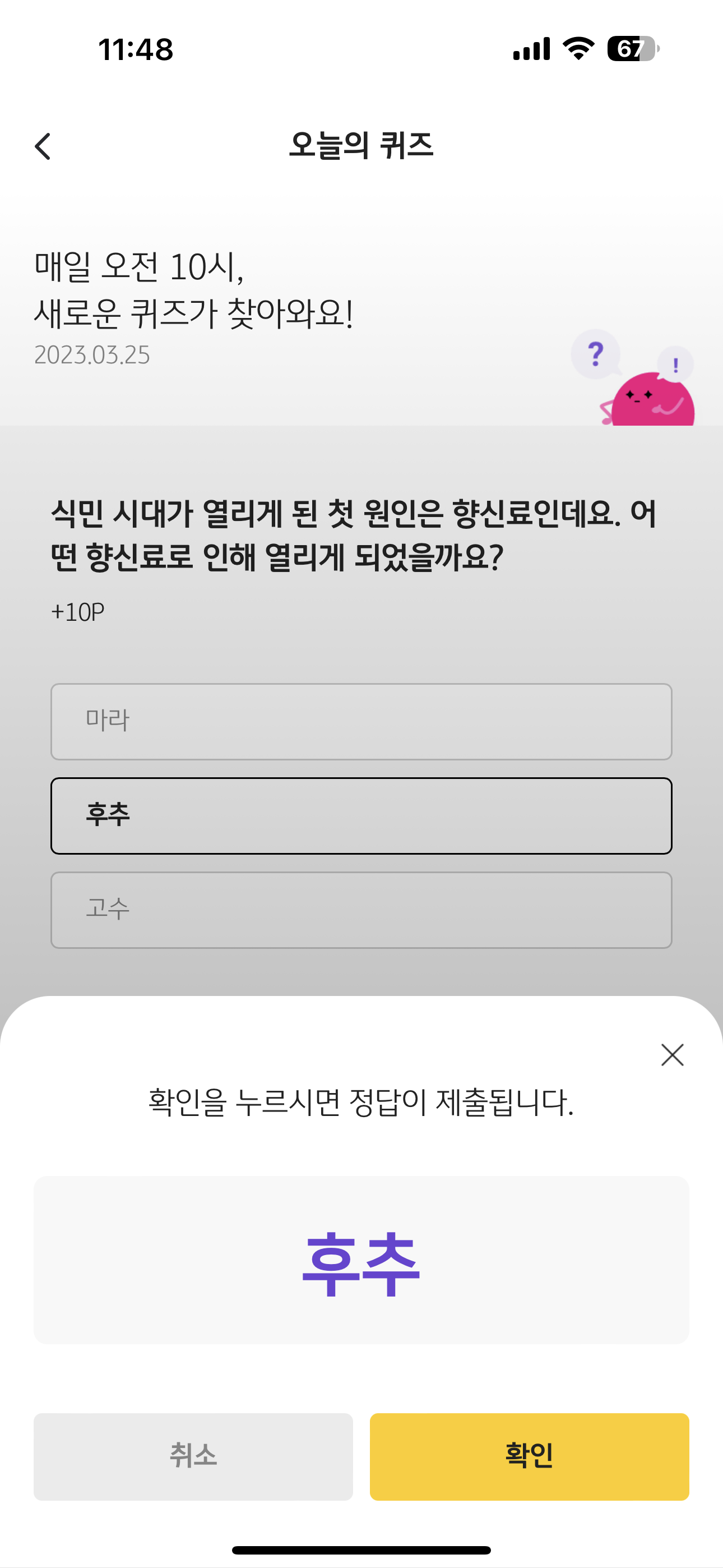 KB PAY 오늘의 퀴즈 3월 25일 정답 ( 식민 시대가 열리게 된 첫 원인은 향신료인데요. 어떤 향신료로 인해 열리게 되었을까요? )