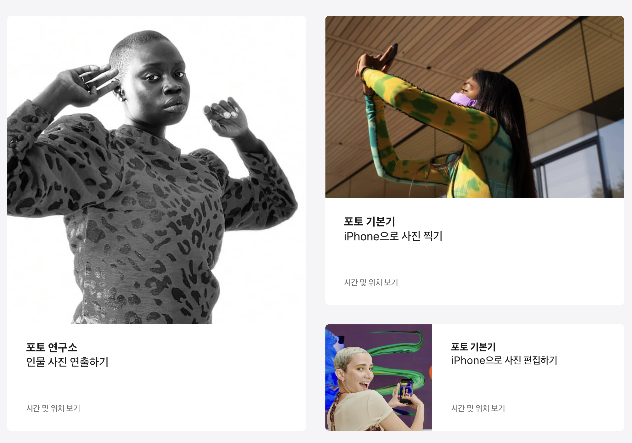 맥 사용 시작하기, 개러지밴드(GarageBand) 시작하기, 메모 앱으로 아이디어 스케치, 인물 사진 연출하기 등 다양한 Today at Apple 세션이 있으니 듣고 싶은 교육이 있다면 신청하고 참여해 보시면 좋을 것 같습니다. 아래 사이트에서 신청할 수 있습니다.