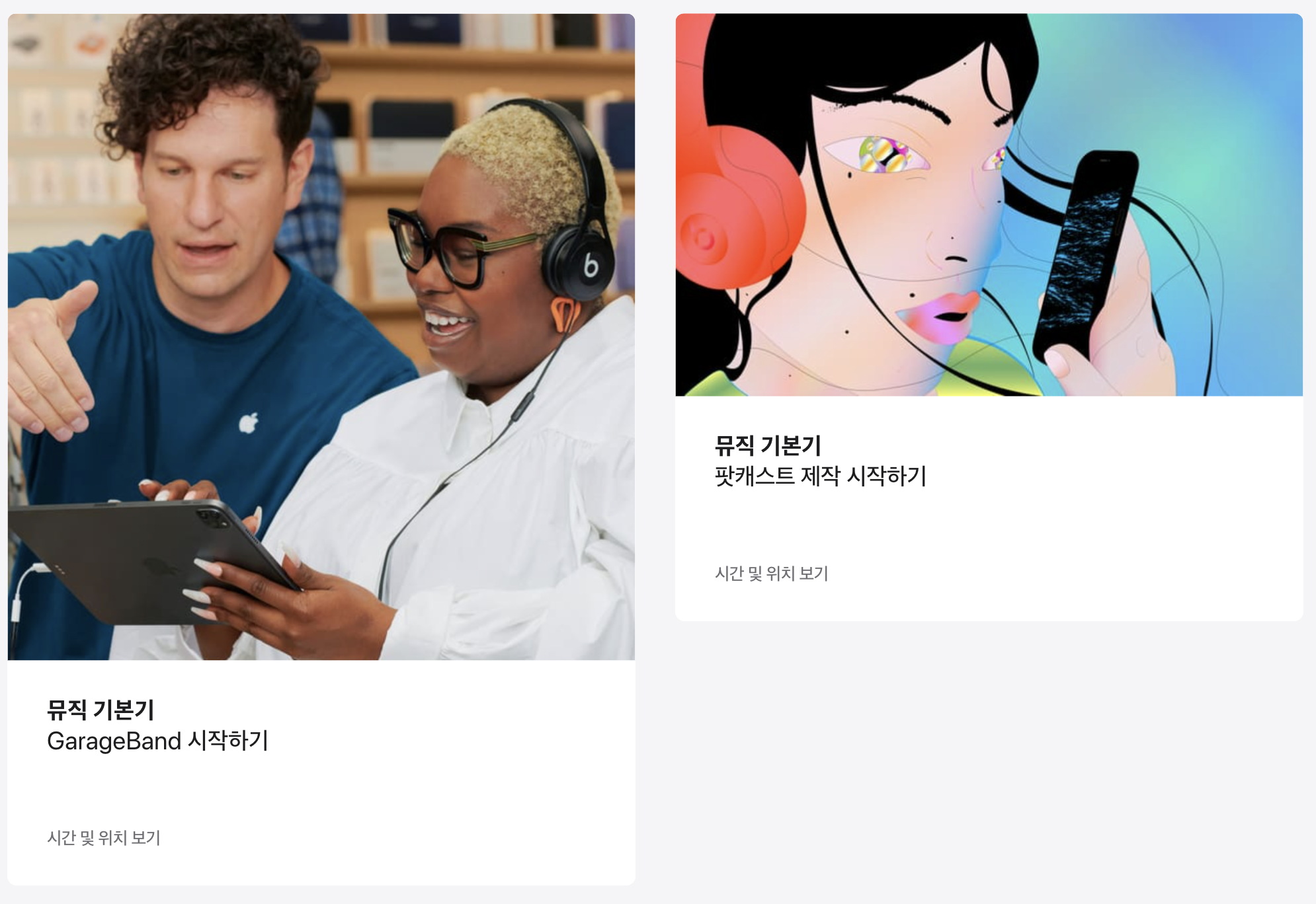 맥 사용 시작하기, 개러지밴드(GarageBand) 시작하기, 메모 앱으로 아이디어 스케치, 인물 사진 연출하기 등 다양한 Today at Apple 세션이 있으니 듣고 싶은 교육이 있다면 신청하고 참여해 보시면 좋을 것 같습니다. 아래 사이트에서 신청할 수 있습니다.