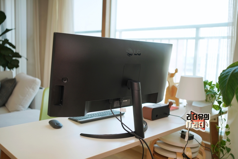 그리고 LG 34인치 울트라와이드 모니터 34WQ60C를 지지하는 스탠드 다리는 슬림하고 라운딩이 들어간 디자인이라 공간 활용성도 뛰어나고 감각적인 디자인 포인트가 되어 줍니다.