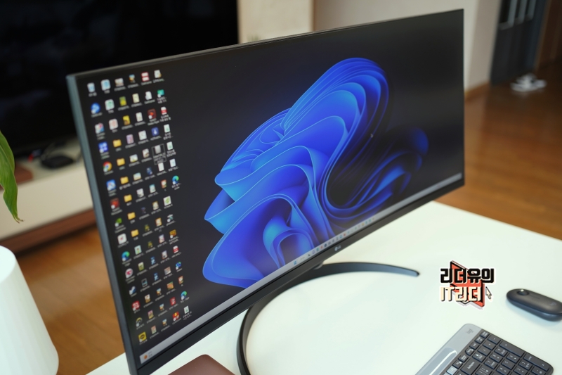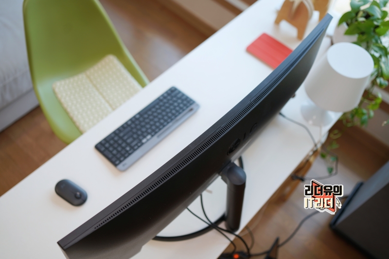 LG 34인치 울트라와이드 모니터 34WQ60C는 살짝 라운딩이 들어간 커브드 모니터입니다. 3800R 곡률이 적용되어 적당한 곡면을 가지고 있는데요. 과하게 라운딩이 들어가지 않아서 편안하게 볼 수 있습니다.