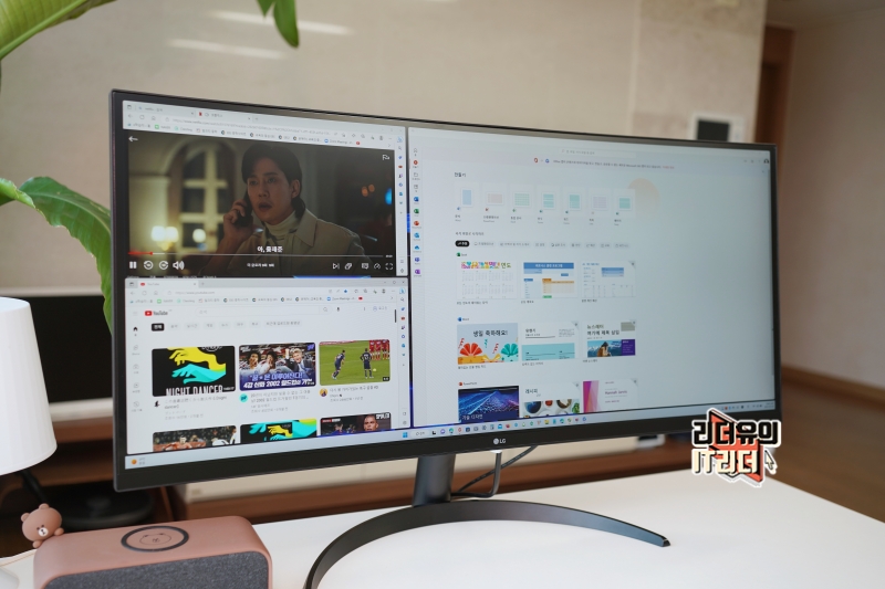 그리고 화면 분할은 업무 내용에 따라 다양한 형태로 조정이 가능하고 이 상태에서도 화면비 조정이 가능해 최적의 화면 구성을 가져갈 수 있습니다. 가벼운 일을 할 때는 위와 같이 영상을 보면서 여유로운 작업 공간을 가져갈 수도 있습니다.