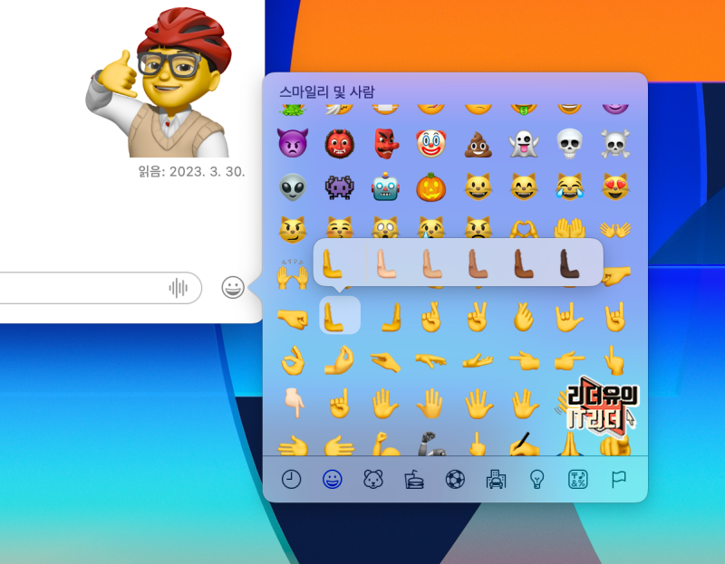마찬가지로 맥OS macOS Ventura 13.3.1 업데이트를 하니 이렇게 피부톤이 표시되고 있습니다.