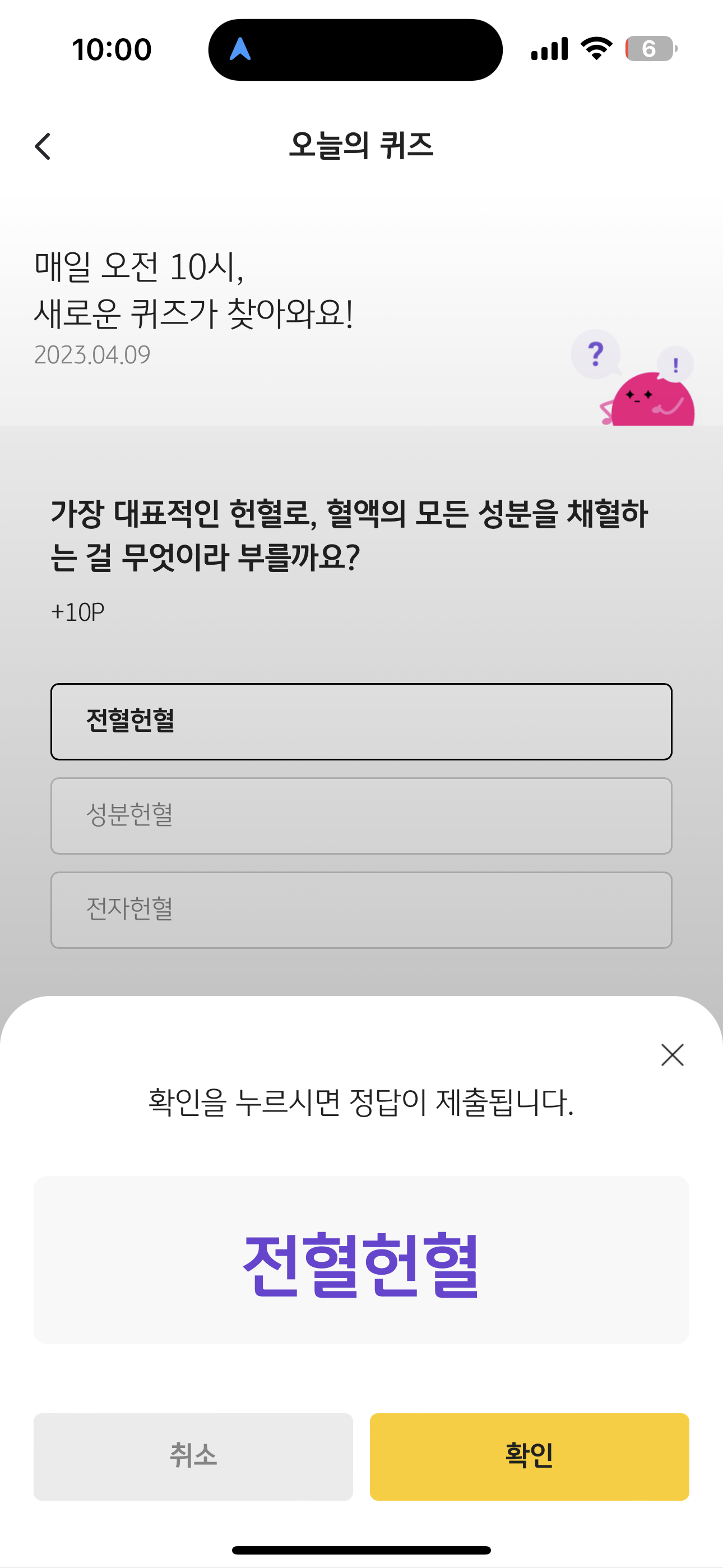 KB Pay 오늘의 퀴즈 정답은 전혈헌혈 입니다.
