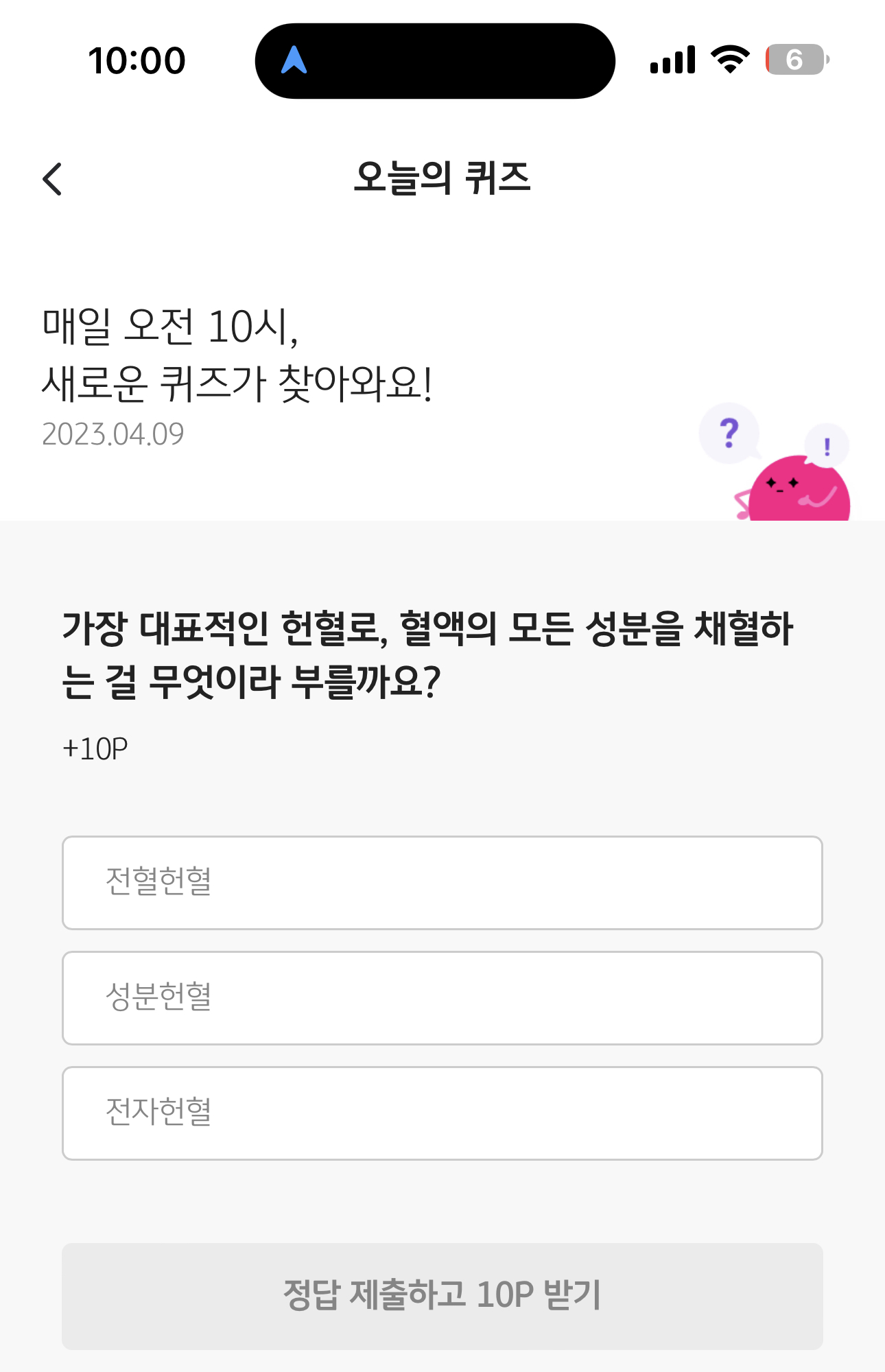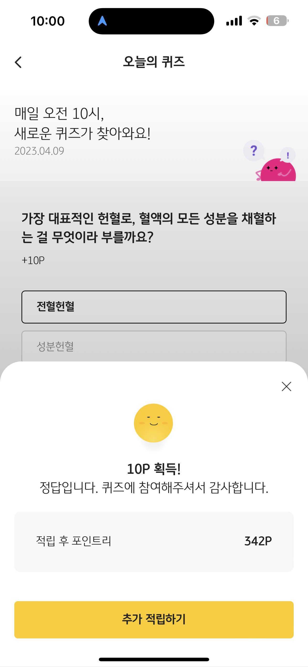 KB Pay 오늘의 퀴즈 4월 9일 정답 (가장 대표적인 헌혈로, 혈액의 모든 성분을 채혈하는 걸 무엇이라고 부를까요)