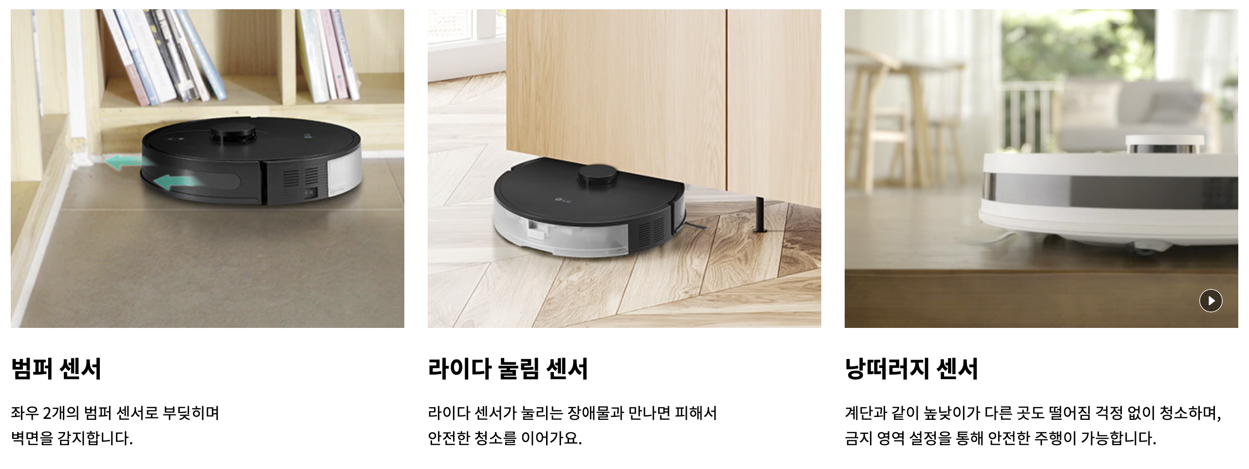 그리고 범퍼센서, 라이다 눌림 센서, 낭떠러지 센서까지 로봇청소기에서 기본이 되는 센서는 잘 갖추고 있습니다.