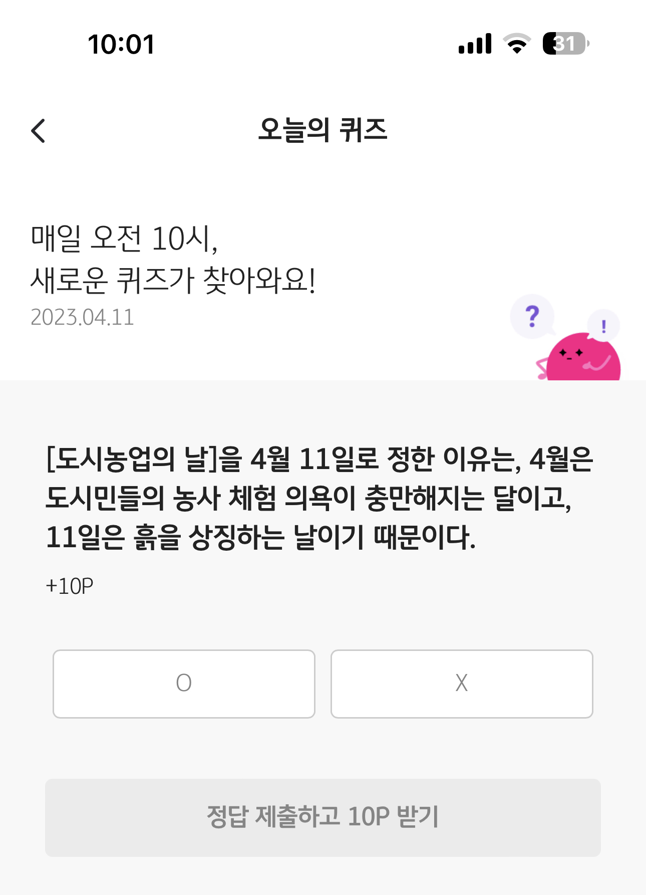 [도시농업의 날]을 4월 11일로 정한 이유는, 4월은 도시민들의 농사 체험 의욕이 충만해지는 달이고, 11일은 흙을 상징하는 날이기 때문이다. O, X 퀴즈인데요. 도시농업의 날은 2017년 도시농업의 육성 및 지원에 관한 법률에 따라 자연친화적인 도시환경 조성을 위한 도시농업의 중요성을 알리기 위하여 국가기념일로 지정된 날입니다.