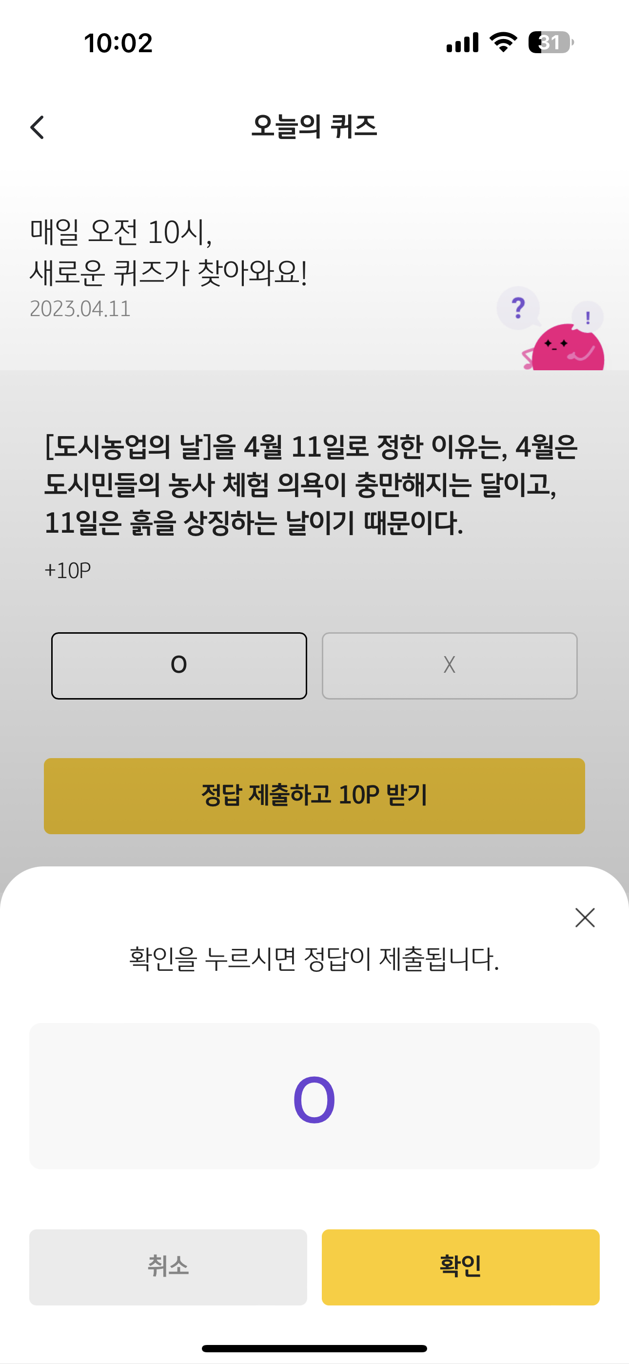 KB Pay 오늘의 퀴즈 정답은 O 입니다