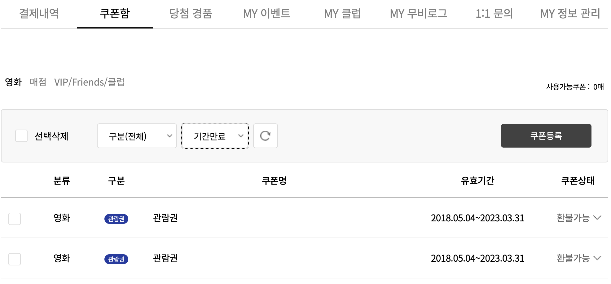 롯데시네마 사이트에 관람권을 등록해 두었다면 쿠폰함에 들어가 있습니다. 그리고 기간이 지났다면 기간만료에 해당 사항이 보이는데 옆에 보면 환불가능이라는 표시가 나오는 걸 볼 수 있습니다.