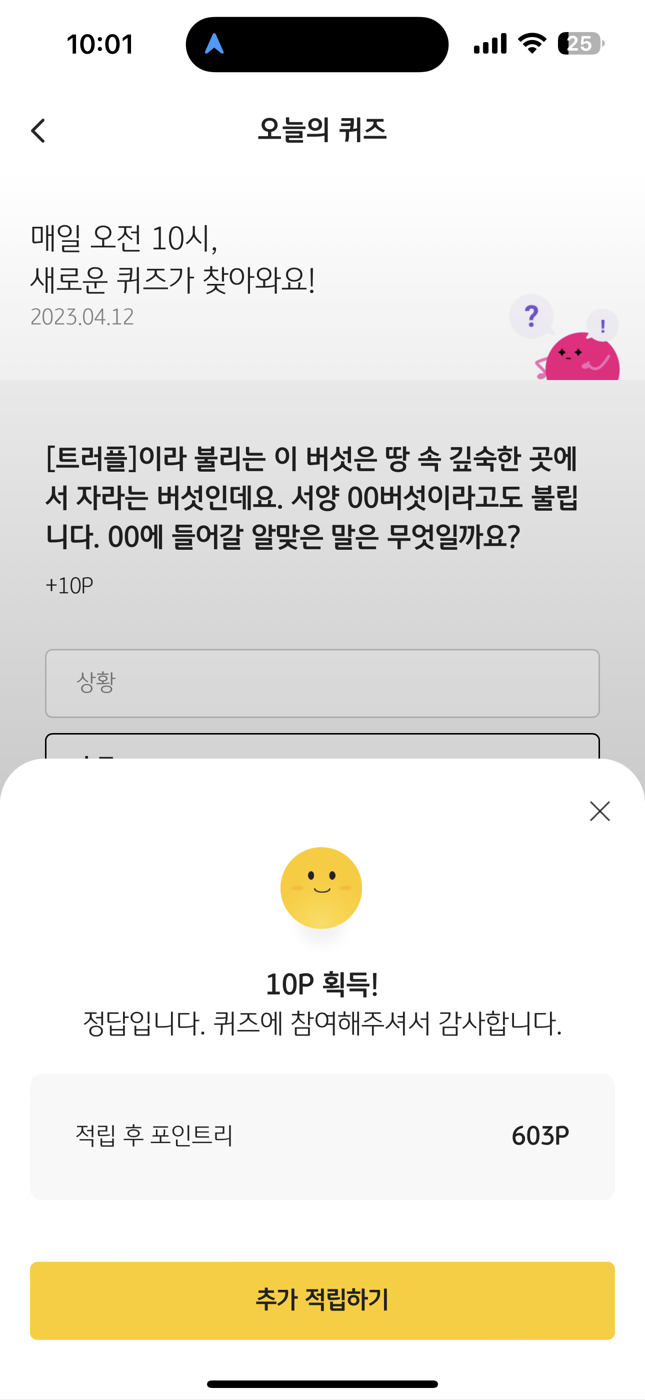 | KB Pay 오늘의 퀴즈 4월 11일 정답 (도시농업의 날을 4월 11일로 정한 이유는 4월은 도시민들의 농사 체험 의욕이 충만해지는 달) (0) | 2023.04.11 |