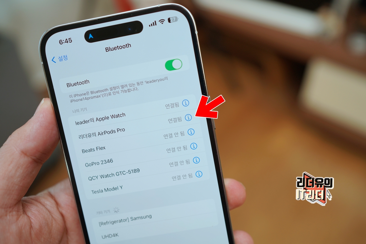 그 다음 블루투스 메뉴로 이동하면 에어팟 리스트가 있습니다. 거기서 느낌표 (i) 메뉴를 선택합니다.