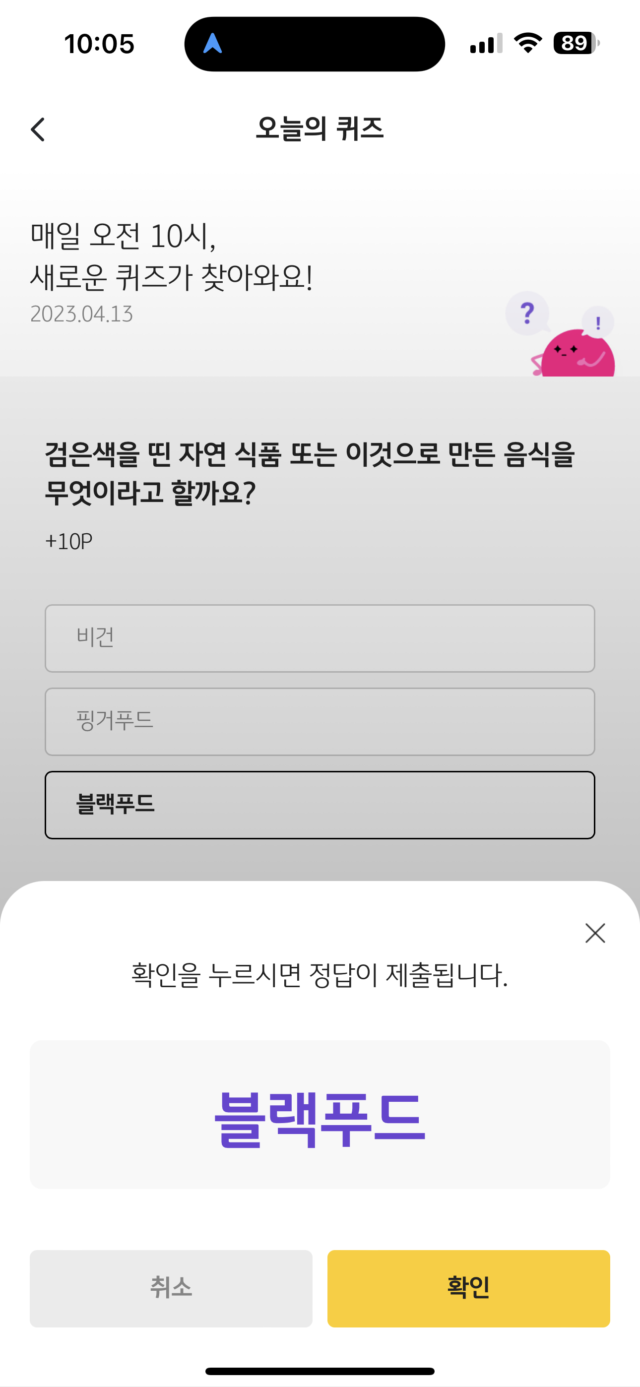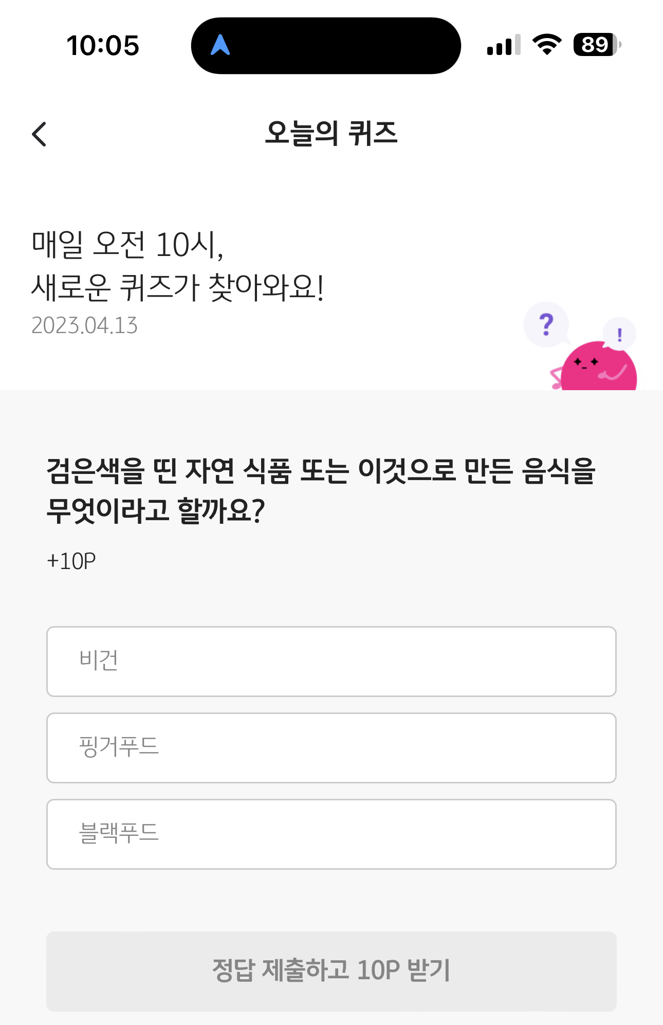 KB Pay 오늘의 퀴즈 4월 13일 정답 ( 검은색을 띤 자연 식품 또는 이것으로 만든 음식을 무엇이라고 할까요? )