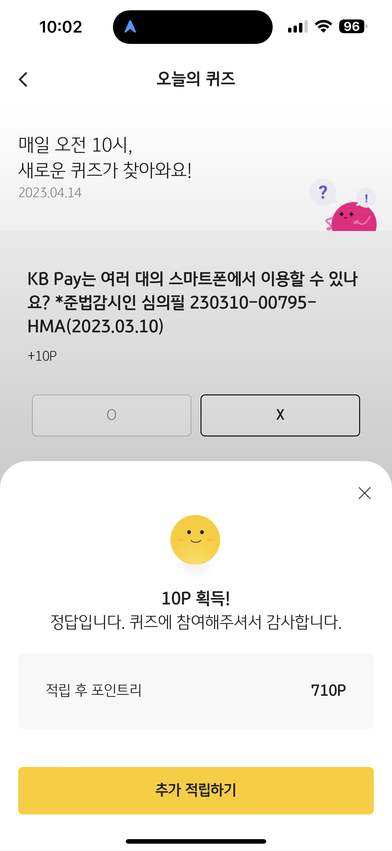 KB pay 오늘의 퀴즈 정답은 X 입니다