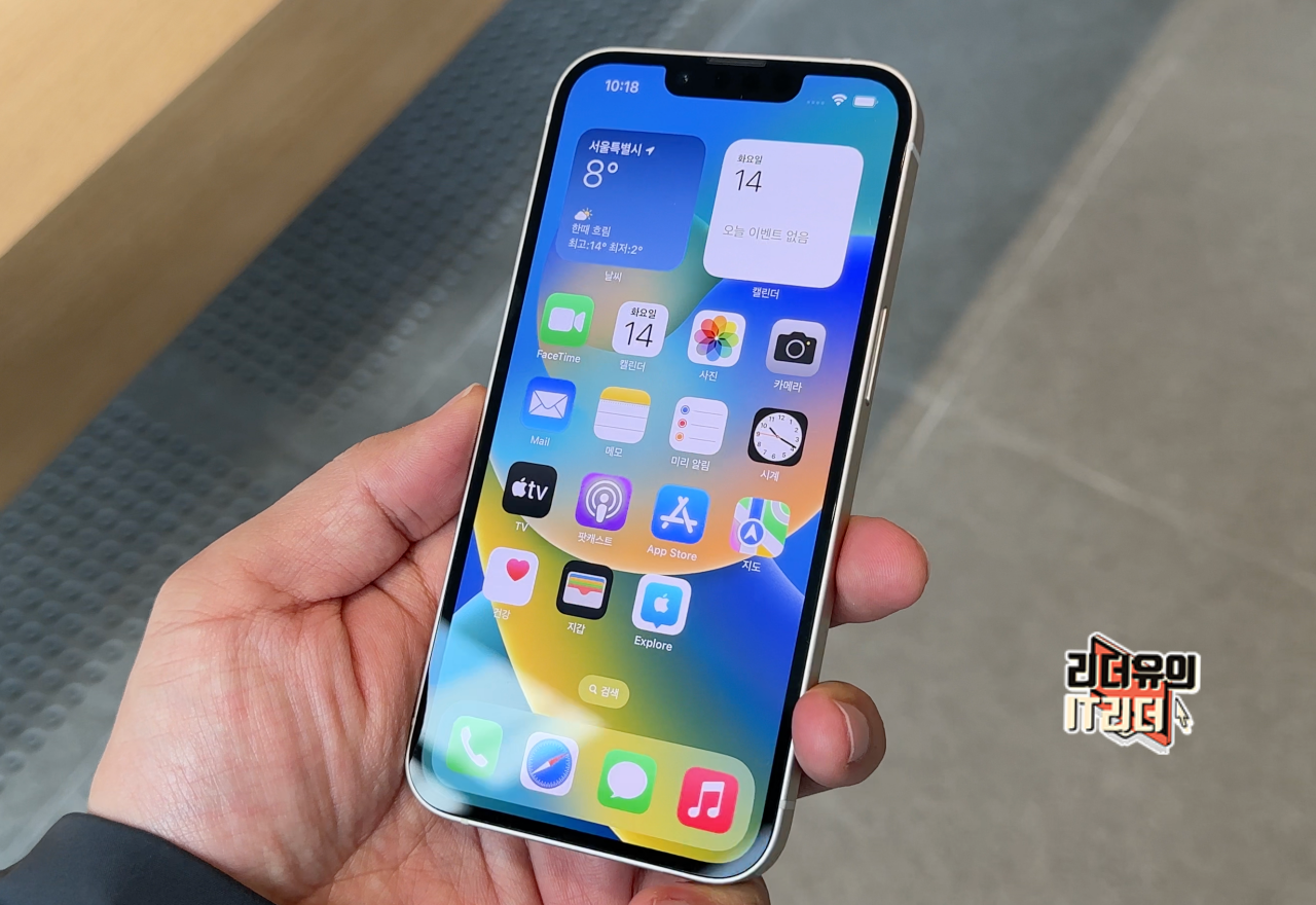 아이폰14 스타라이트 색상 전면 모습입니다. 블랙의 베젤과 실버 라인은 가장 무난하면서도 가장 세련된 컬러 조합이라 하는데요. 새로움은 없지만 오래 봐도 질리지 않는 컬러 조합입니다.