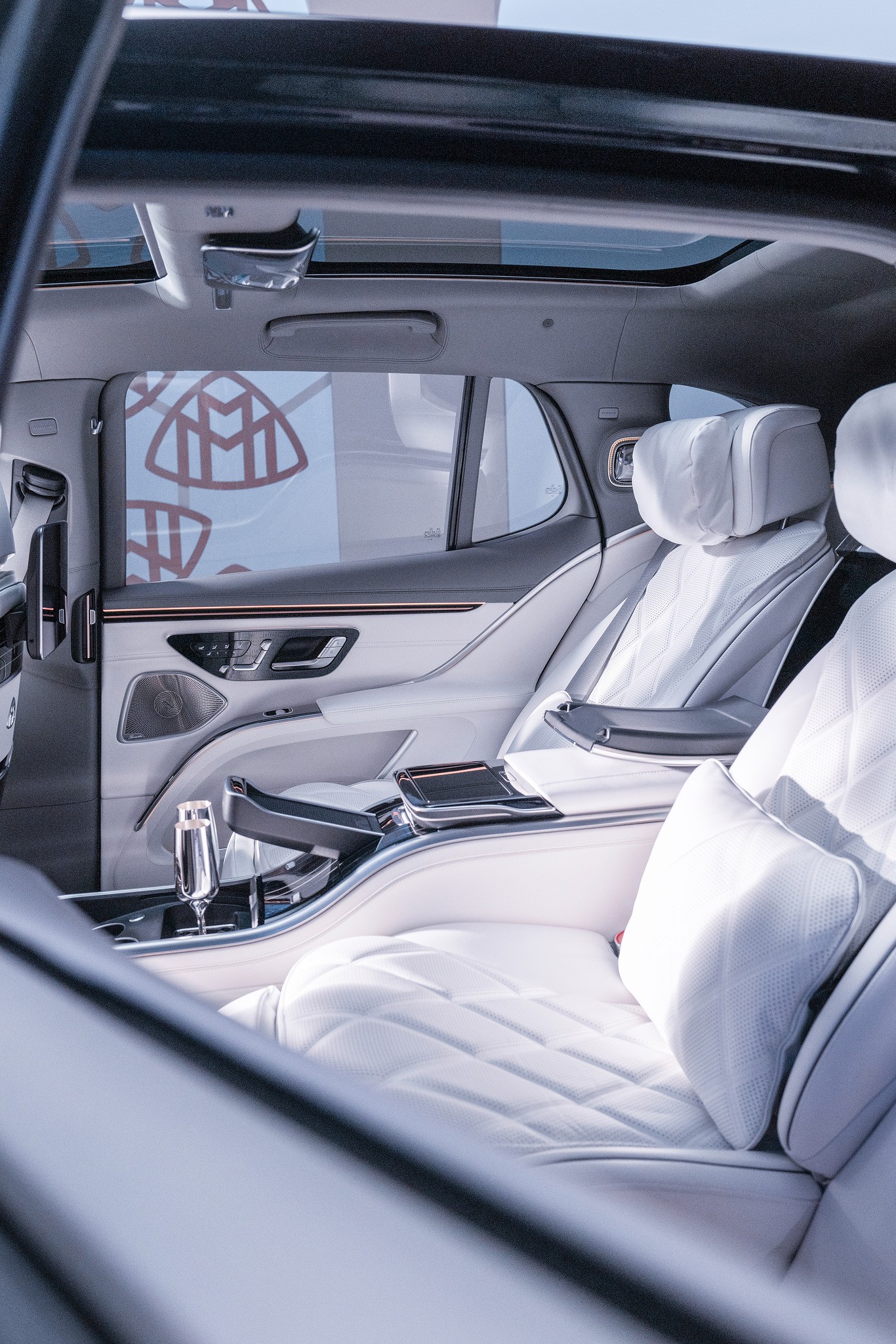 마이바흐 EQS SUV 전기차 뒷좌석은 비행기 1등석처럼 뒤쪽으로 눞혀지고 다리 받침대도 올라와 안락한 실내 공간을 느낄 수 있게 했습니다.