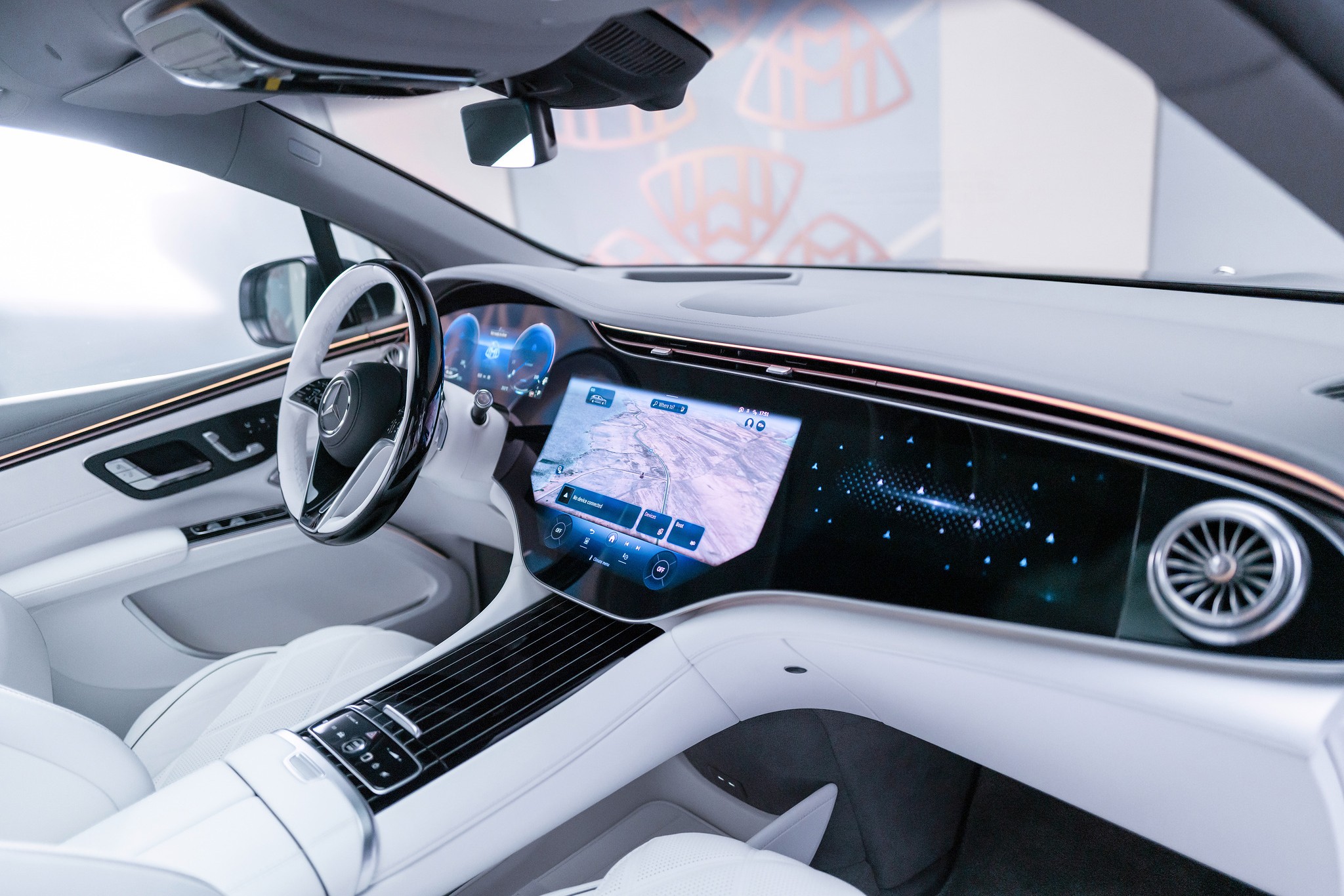 마이바흐 EQS SUV 전기차 대시보드에는 대형 디스플레이가 가득차있고 안에 들어간 이미지도 마이바흐 로고가 들어가 있습니다.