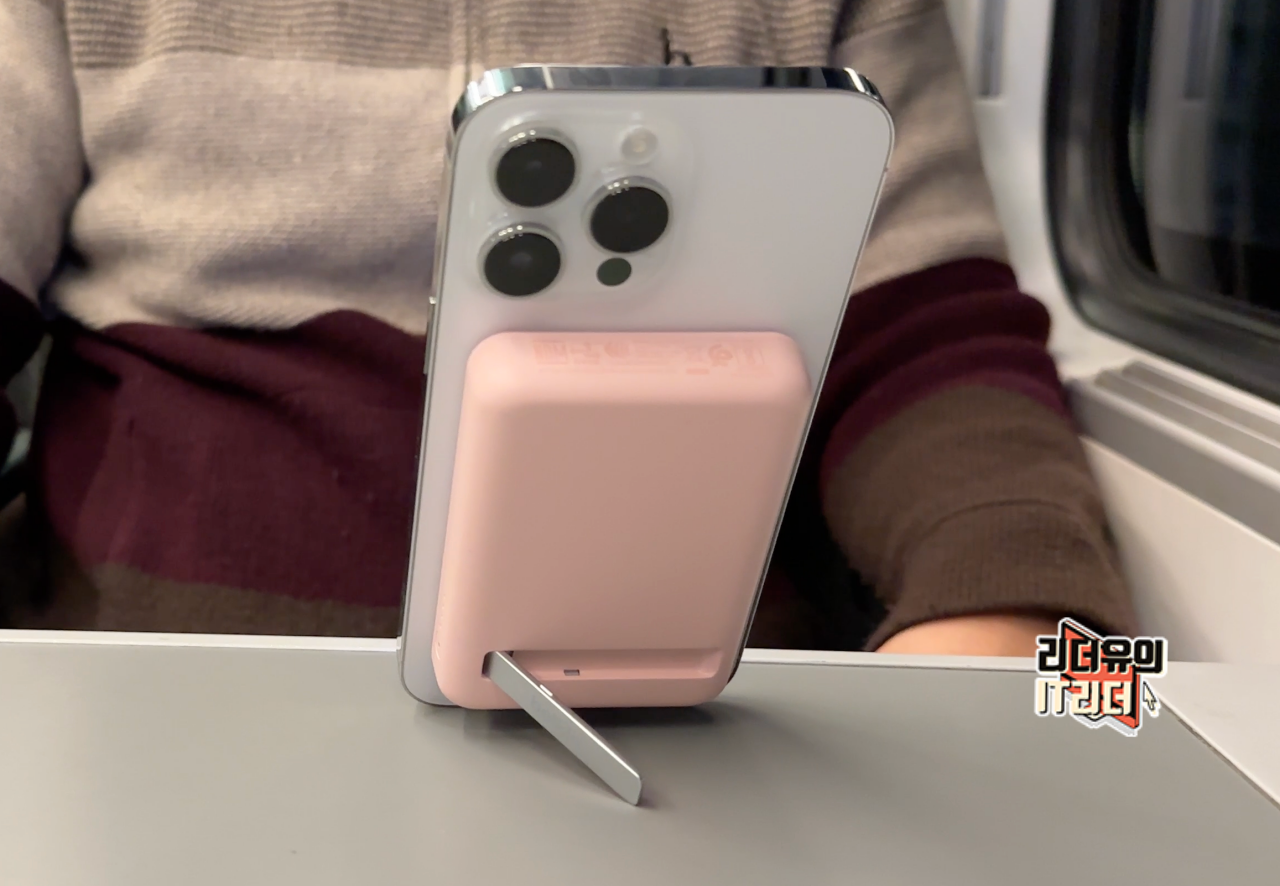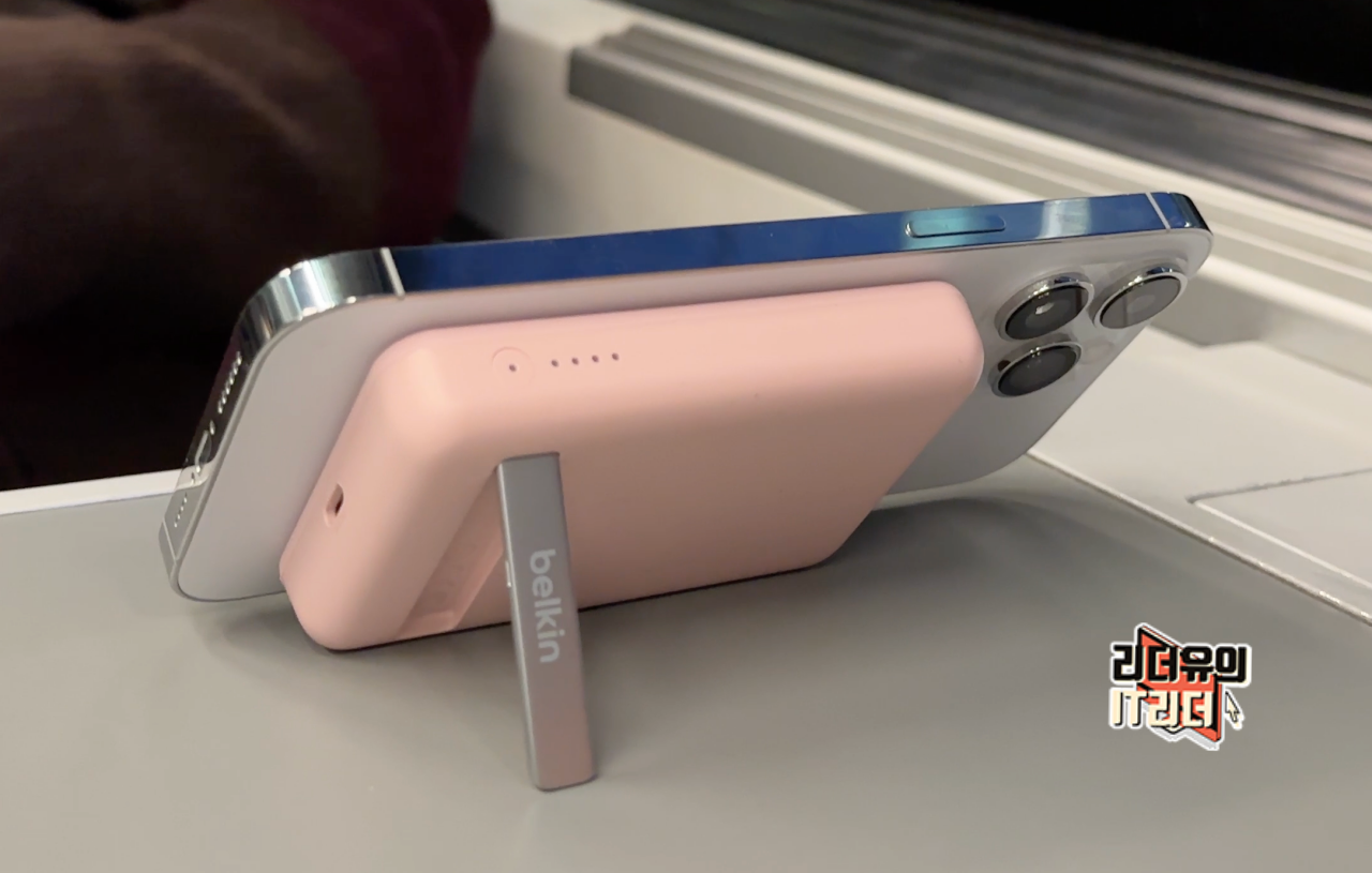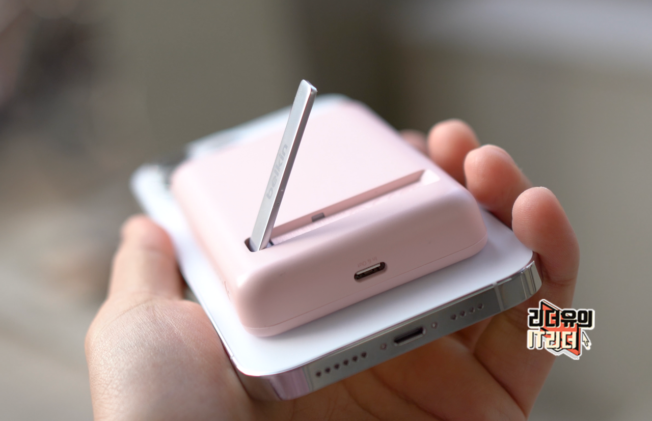 벨킨 맥세이프 보조배터리 BPD004는 스탠드를 내장해 거치할 수 있는 매력도 갖추고 있습니다. 맥세이프 보조배터리를 장착하면 세워두기가 애매해지는데요. 스탠드를 제공하니 영화 감상 및 책상 위에 두기에 좋습니다.