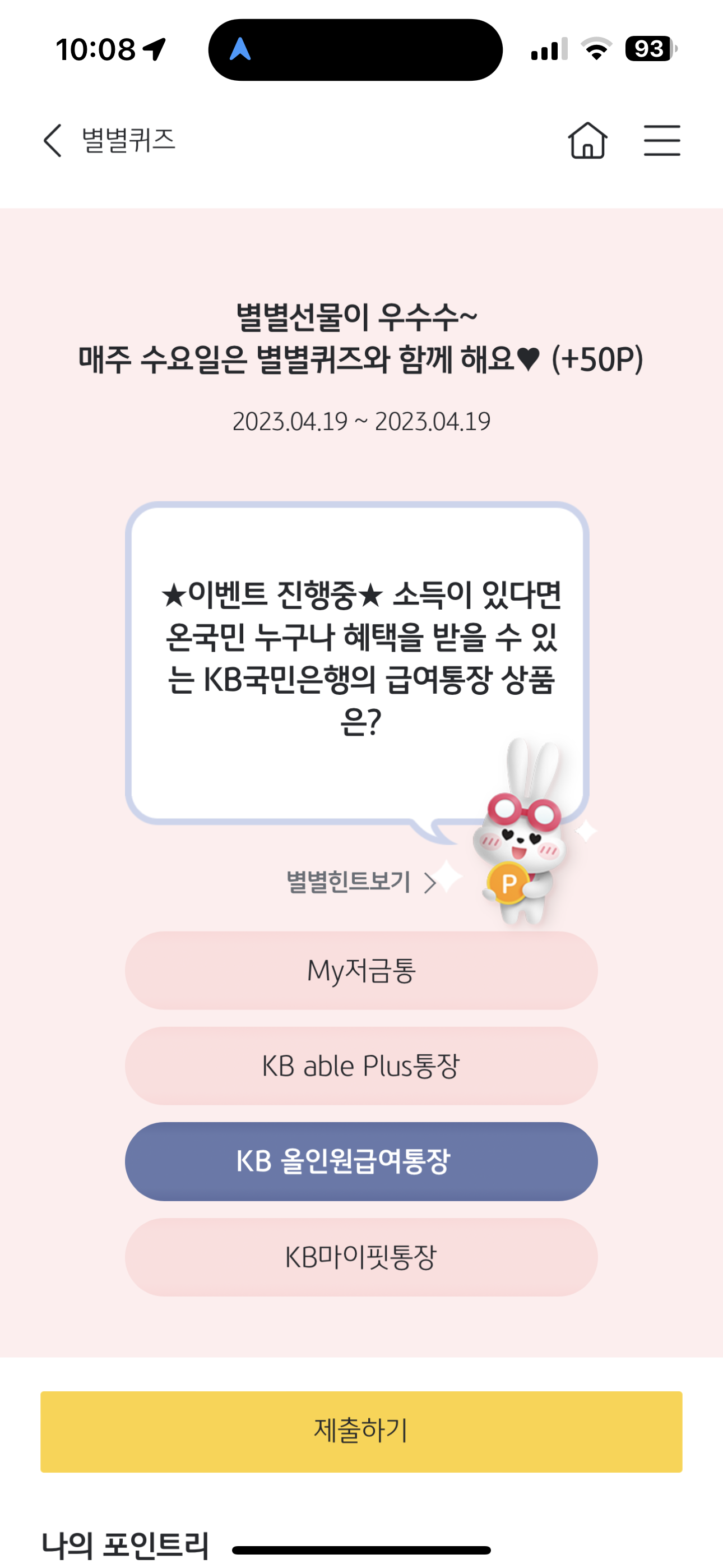 KB스타뱅킹 별별퀴즈 4월 19일 정답 (소득이 있다면 온국민 누구나 혜택을 받을 수 있는 KB국민은행의 급여통장 상품은?)