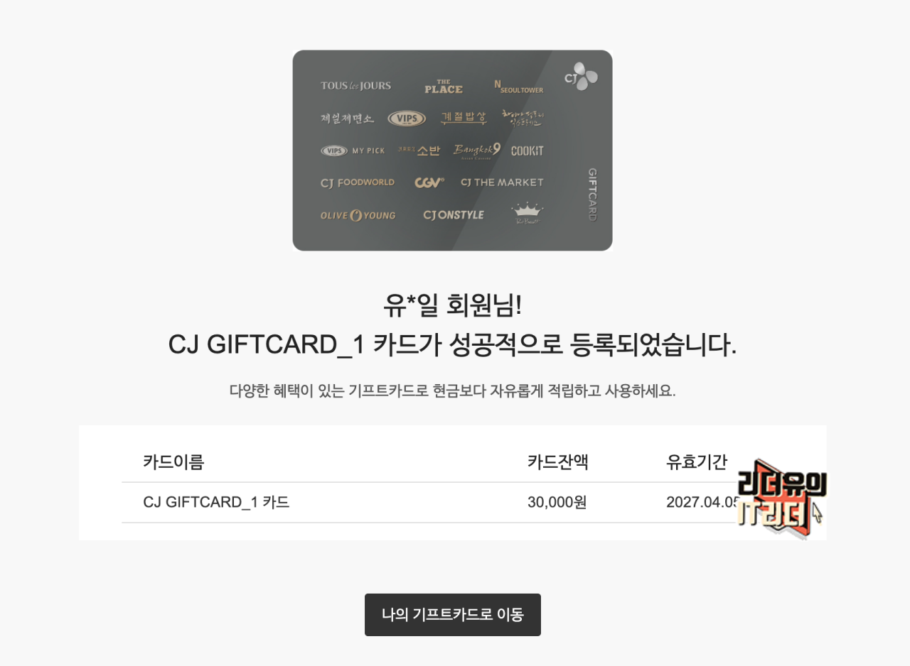 CJ 기프트카드 등록이 완료되었습니다. 카드잔액이 얼마인지 알 수 있고 유효기간도 명시되어 있습니다.