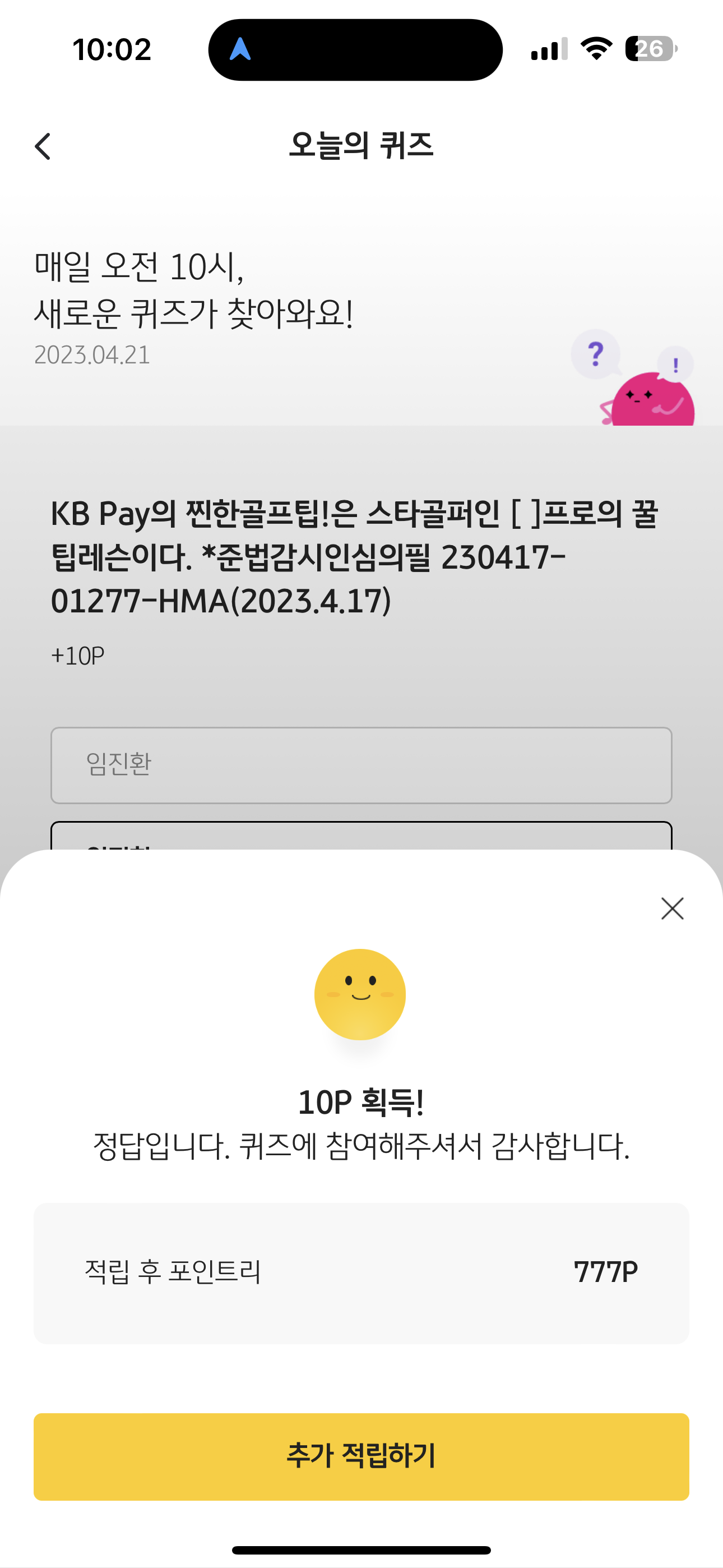 KB Pay 오늘의 퀴즈 정답은 임진한 입니다