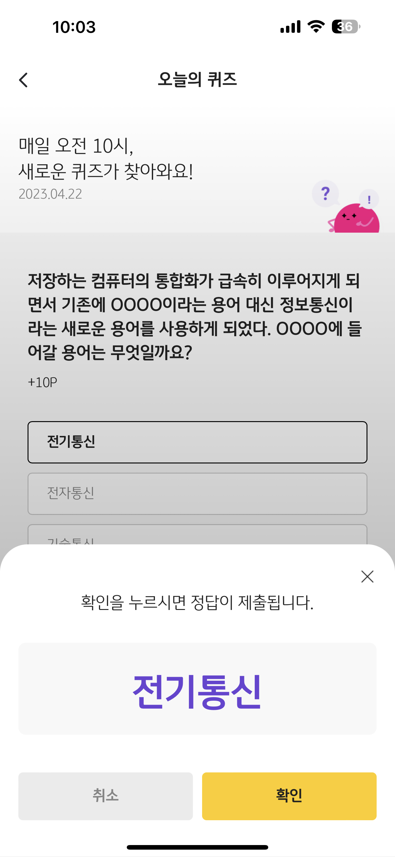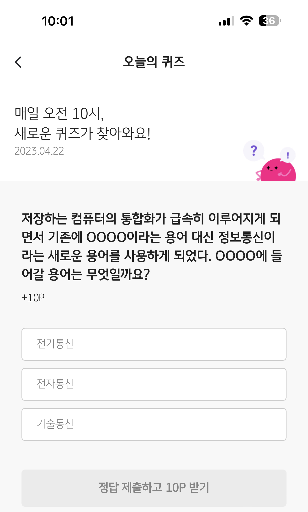 KB Pay 오늘의 퀴즈 정답은 전기통신 입니다