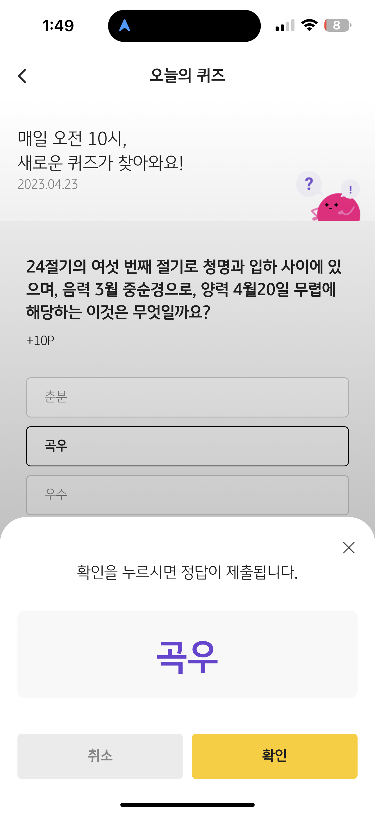KB Pay 오늘의 퀴즈 정답은 곡우 입니다