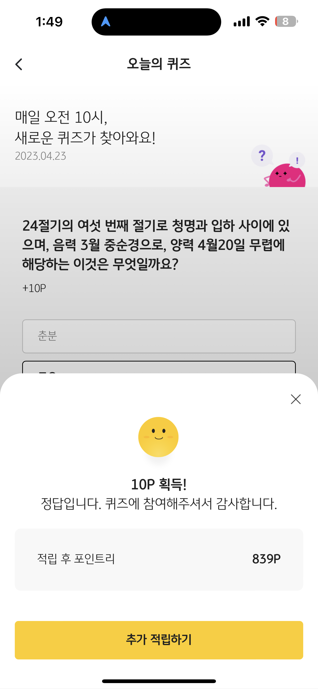 KB Pay 오늘의 퀴즈 4월 23일 정답 (24절기의 여섯 번째 절기로 청명과 입하 사이에 있으며, 음력 3월 중순경으로 )