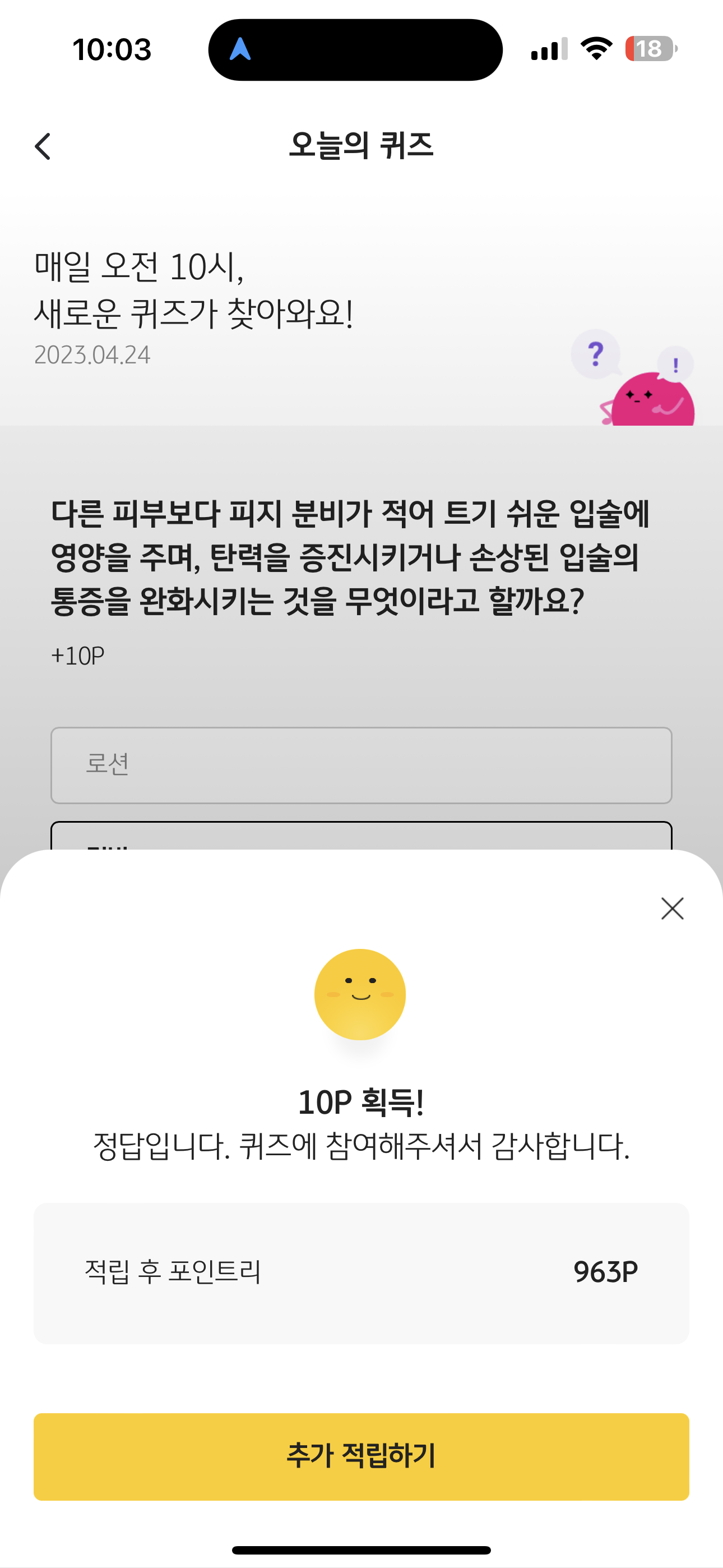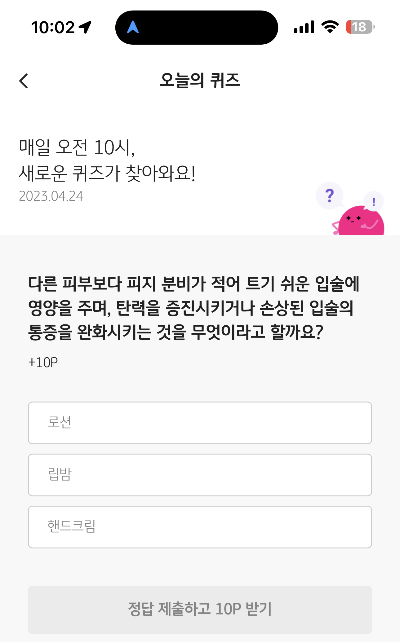 KB Pay 오늘의 퀴즈 4월 24일 정답 (다른 피부보다 피지 분비가 적어 트기 쉬운 입술에 영양을 주며, 탄력을 증진시키거나 )
