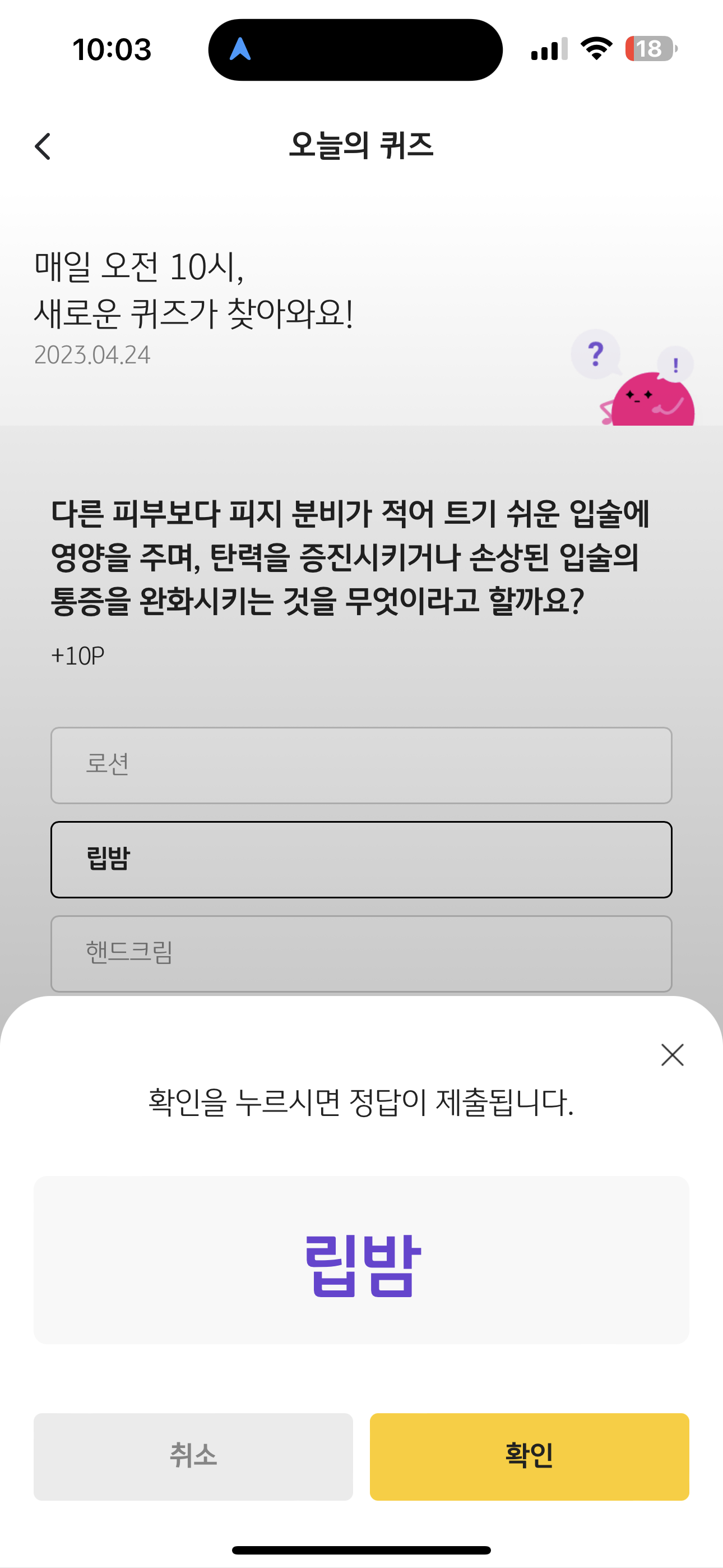 KB Pay 오늘의 퀴즈 정답은 립밤 입니다