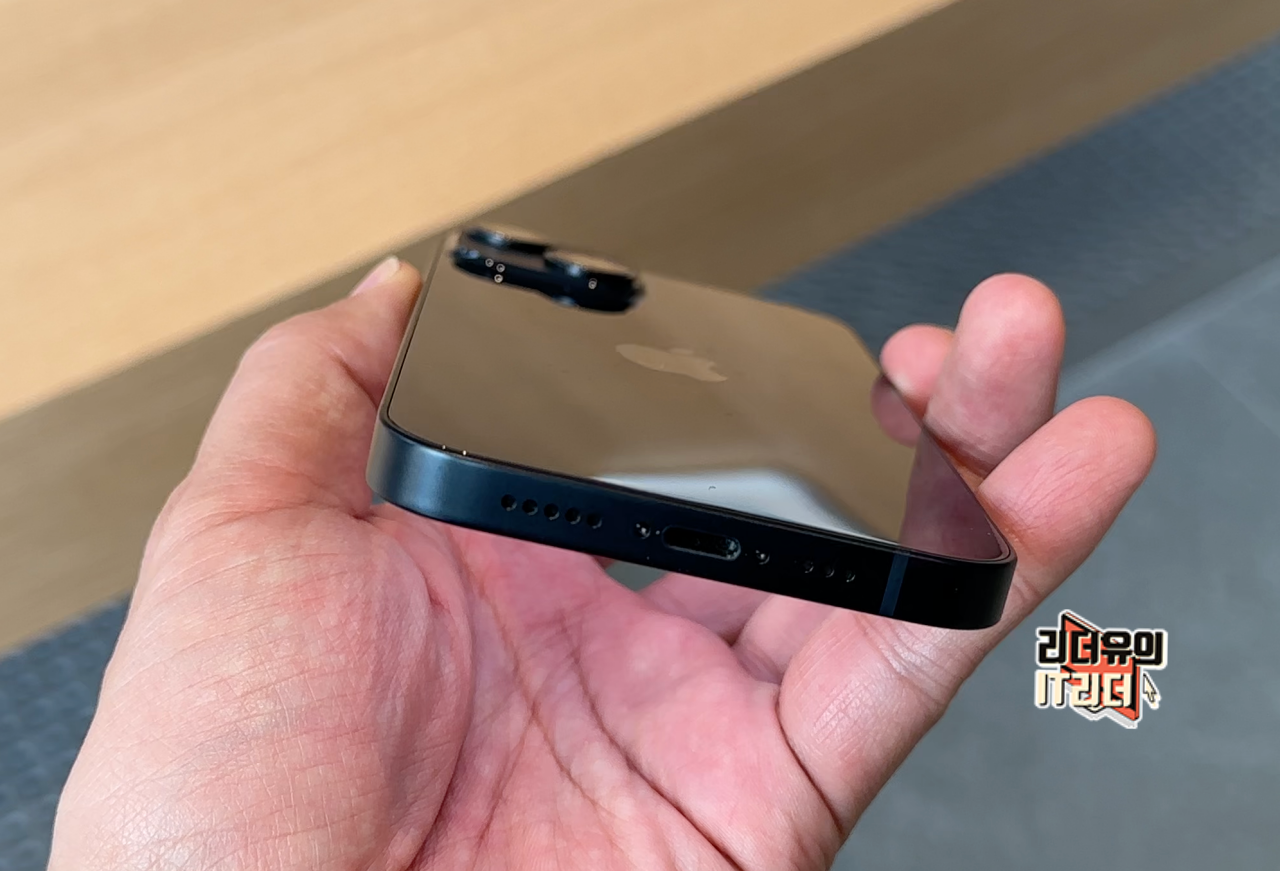 아이폰14 미드나이트 아랫면에는 라이트닝 단자와 스피커홀이 있습니다.
