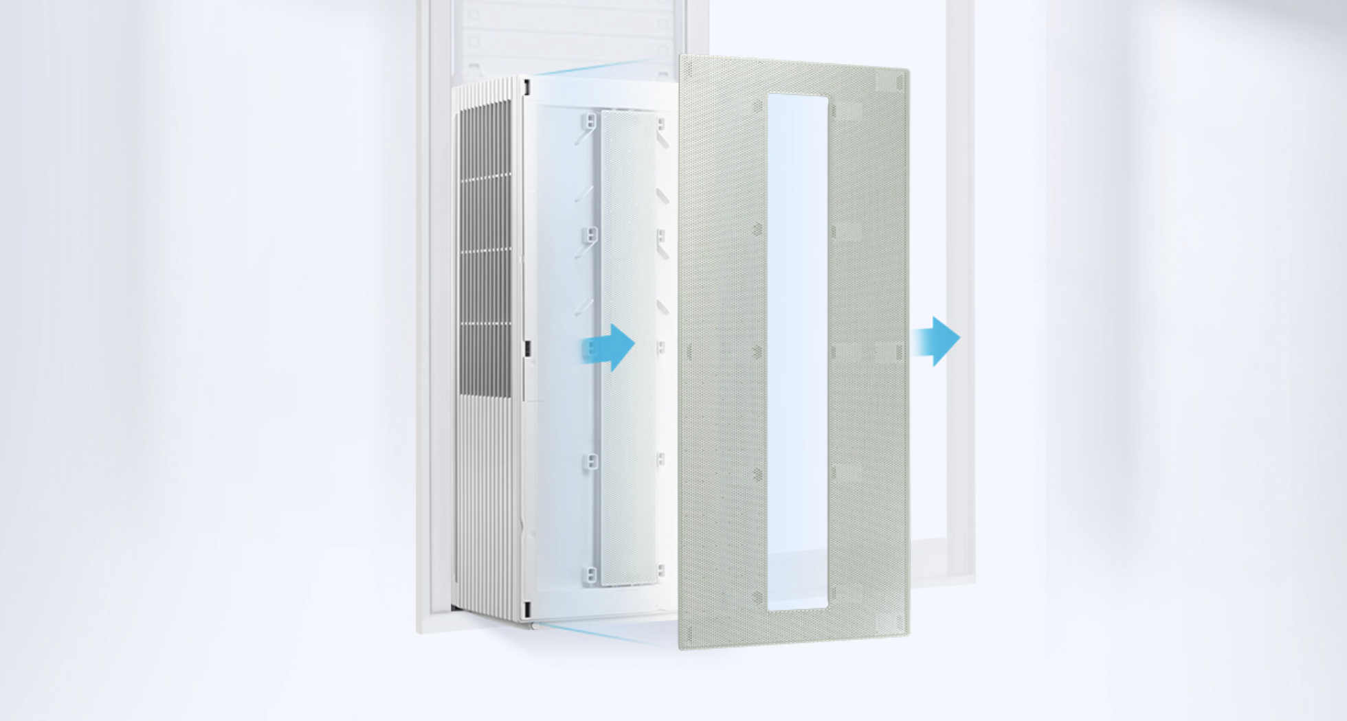 무풍 패널과 극세 필터는 간편하게 분리해 직접 세척할 수 있게 이지오픈 패널을 적용했습니다. 그리고 황화구리 성분의 원사를 적용해 유해섹균 증식을 99.9% 억제하는 향균구리극세필터가 추가되었습니다.
