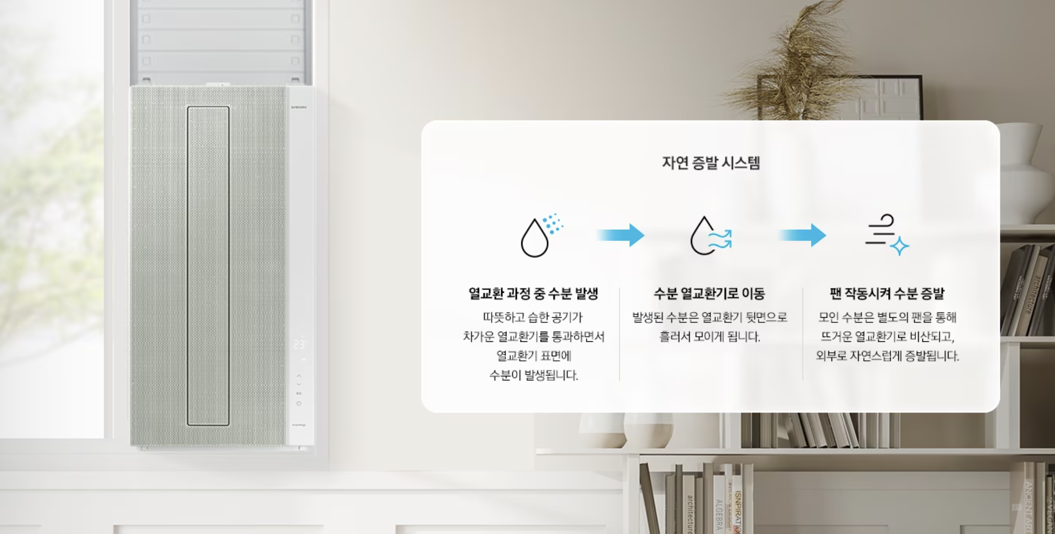 2023년 삼성 창문형 에어컨 비스포크 윈도우핏은 하루 최대 34.3ℓ의 대용량 제습 기능을 지원합니다. 장마철이 되면 제습기 사용도 많이 하는데요. 창문형 에어컨 하나로 다 해소가 가능합니다. 그리고 일반적인 제습기는 물을 비워줘야 하는데 배관 설치가 필요 없는 자연 증발 시스템을 적용해 더욱 편한 제습기 사용성을 느낄 수 있습니다.