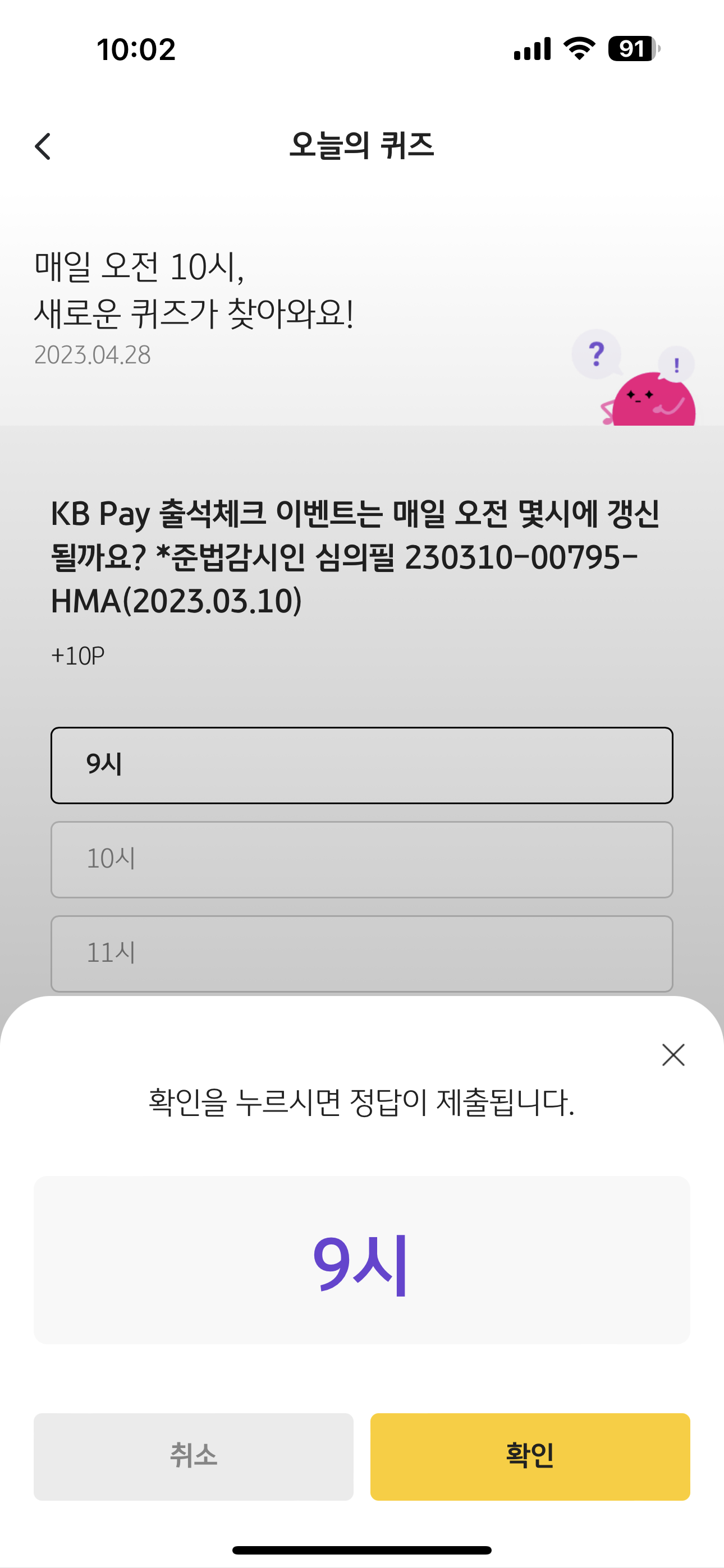 KB Pay 오늘의 퀴즈 정답은 9시 입니다