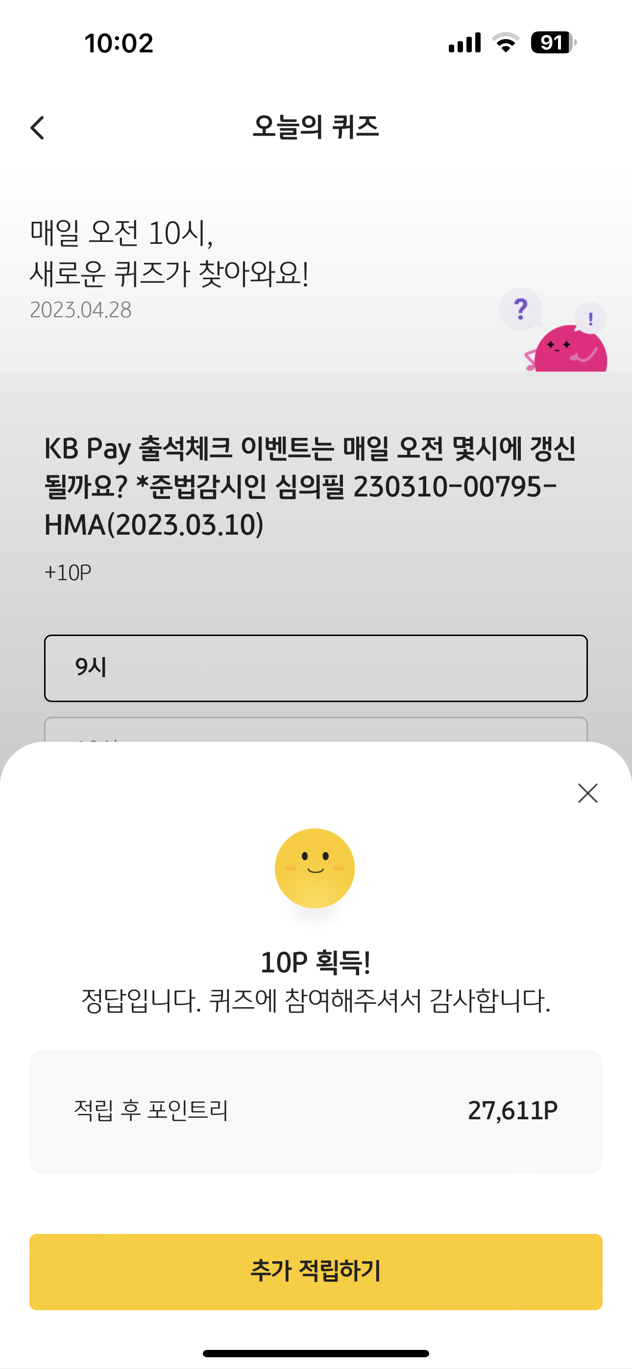 KB Pay 출석체크 이벤트는 매일 오전 몇시에 갱신 될까요? *준법감시인 심의필 230310-00795-HMA(2023.03.10) 보기는 1. 9시 2. 10시 3. 11시 입니다.