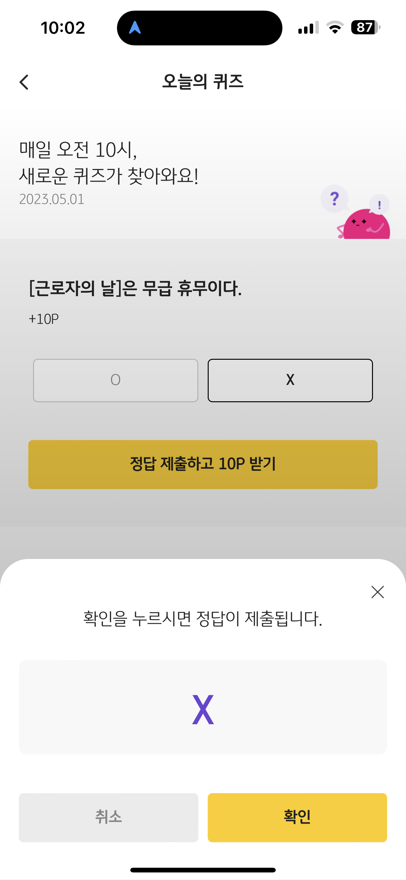 KB Pay 오늘의 퀴즈 정답은 X 입니다